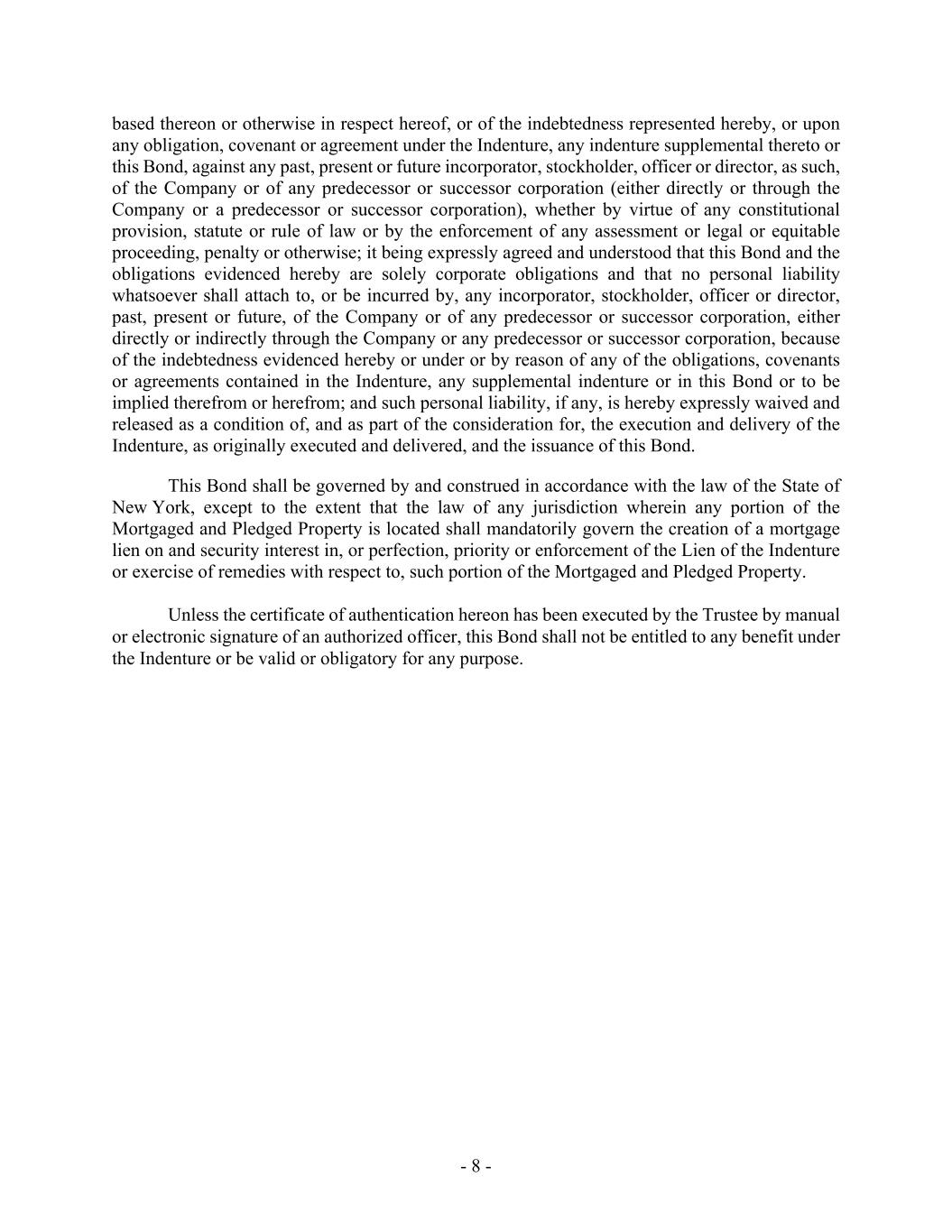 - 8 - based thereon or otherwise in respect hereof, or of the indebtedness represented hereby, or upon any obligation, covenant or agreement under the Indenture, any indenture supplemental thereto or this Bond, against any past, present or future incorporator, stockholder, officer or director, as such, of the Company or of any predecessor or successor corporation (either directly or through the Company or a predecessor or successor corporation), whether by virtue of any constitutional provision, statute or rule of law or by the enforcement of any assessment or legal or equitable proceeding, penalty or otherwise; it being expressly agreed and understood that this Bond and the obligations evidenced hereby are solely corporate obligations and that no personal liability whatsoever shall attach to, or be incurred by, any incorporator, stockholder, officer or director, past, present or future, of the Company or of any predecessor or successor corporation, either directly or indirectly through the Company or any predecessor or successor corporation, because of the indebtedness evidenced hereby or under or by reason of any of the obligations, covenants or agreements contained in the Indenture, any supplemental indenture or in this Bond or to be implied therefrom or herefrom; and such personal liability, if any, is hereby expressly waived and released as a condition of, and as part of the consideration for, the execution and delivery of the Indenture, as originally executed and delivered, and the issuance of this Bond. This Bond shall be governed by and construed in accordance with the law of the State of New York, except to the extent that the law of any jurisdiction wherein any portion of the Mortgaged and Pledged Property is located shall mandatorily govern the creation of a mortgage lien on and security interest in, or perfection, priority or enforcement of the Lien of the Indenture or exercise of remedies with respect to, such portion of the Mortgaged and Pledged Property. Unless the certificate of authentication hereon has been executed by the Trustee by manual or electronic signature of an authorized officer, this Bond shall not be entitled to any benefit under the Indenture or be valid or obligatory for any purpose.