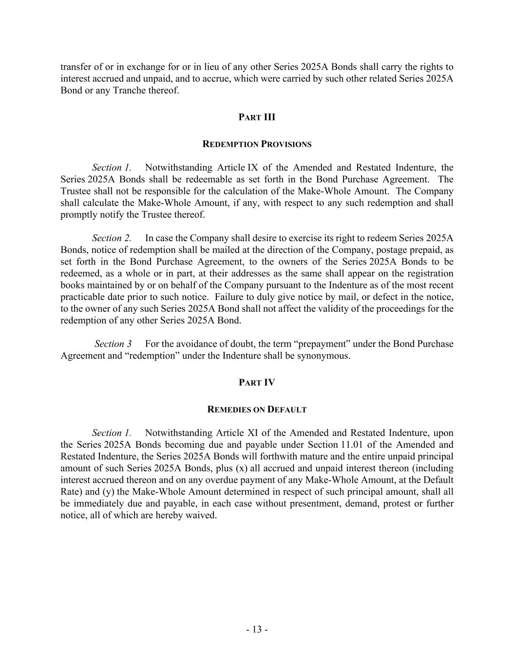 - 13 - transfer of or in exchange for or in lieu of any other Series 2025A Bonds shall carry the rights to interest accrued and unpaid, and to accrue, which were carried by such other related Series 2025A Bond or any Tranche thereof. PART III REDEMPTION PROVISIONS Section 1. Notwithstanding Article IX of the Amended and Restated Indenture, the Series 2025A Bonds shall be redeemable as set forth in the Bond Purchase Agreement. The Trustee shall not be responsible for the calculation of the Make-Whole Amount. The Company shall calculate the Make-Whole Amount, if any, with respect to any such redemption and shall promptly notify the Trustee thereof. Section 2. In case the Company shall desire to exercise its right to redeem Series 2025A Bonds, notice of redemption shall be mailed at the direction of the Company, postage prepaid, as set forth in the Bond Purchase Agreement, to the owners of the Series 2025A Bonds to be redeemed, as a whole or in part, at their addresses as the same shall appear on the registration books maintained by or on behalf of the Company pursuant to the Indenture as of the most recent practicable date prior to such notice. Failure to duly give notice by mail, or defect in the notice, to the owner of any such Series 2025A Bond shall not affect the validity of the proceedings for the redemption of any other Series 2025A Bond. Section 3 For the avoidance of doubt, the term “prepayment” under the Bond Purchase Agreement and “redemption” under the Indenture shall be synonymous. PART IV REMEDIES ON DEFAULT Section 1. Notwithstanding Article XI of the Amended and Restated Indenture, upon the Series 2025A Bonds becoming due and payable under Section 11.01 of the Amended and Restated Indenture, the Series 2025A Bonds will forthwith mature and the entire unpaid principal amount of such Series 2025A Bonds, plus (x) all accrued and unpaid interest thereon (including interest accrued thereon and on any overdue payment of any Make-Whole Amount, at the Default Rate) and (y) the Make-Whole Amount determined in respect of such principal amount, shall all be immediately due and payable, in each case without presentment, demand, protest or further notice, all of which are hereby waived.