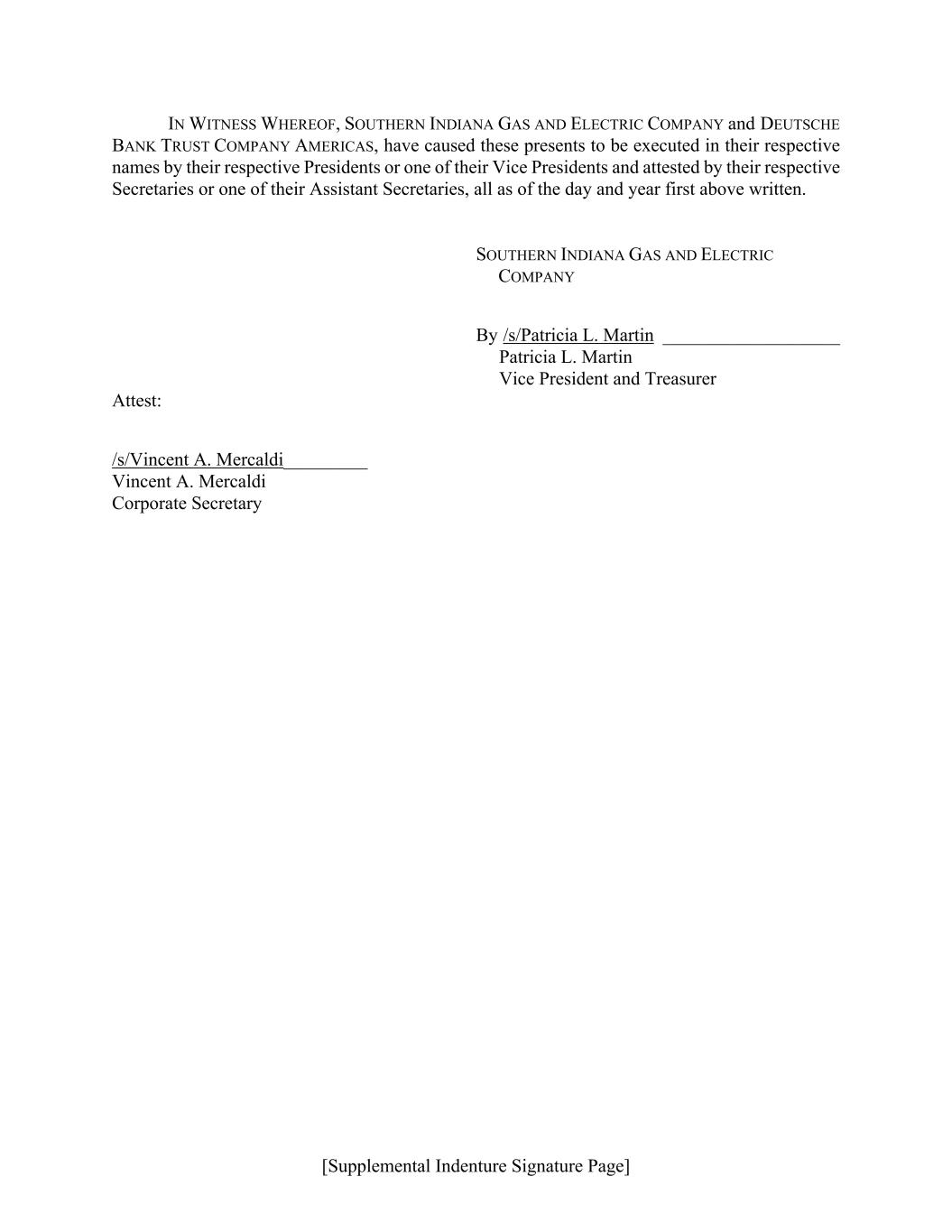 [Supplemental Indenture Signature Page] IN WITNESS WHEREOF, SOUTHERN INDIANA GAS AND ELECTRIC COMPANY and DEUTSCHE BANK TRUST COMPANY AMERICAS, have caused these presents to be executed in their respective names by their respective Presidents or one of their Vice Presidents and attested by their respective Secretaries or one of their Assistant Secretaries, all as of the day and year first above written. SOUTHERN INDIANA GAS AND ELECTRIC COMPANY By /s/Patricia L. Martin ___________________ Patricia L. Martin Vice President and Treasurer Attest: /s/Vincent A. Mercaldi_________ Vincent A. Mercaldi Corporate Secretary