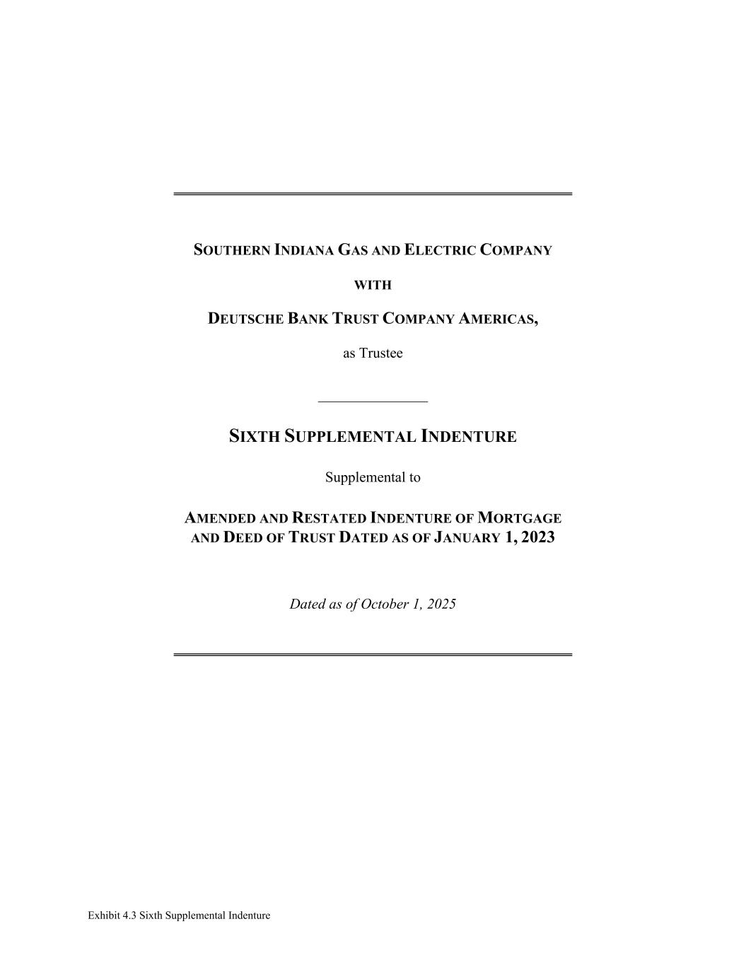 Exhibit 4.3 Sixth Supplemental Indenture SOUTHERN INDIANA GAS AND ELECTRIC COMPANY WITH DEUTSCHE BANK TRUST COMPANY AMERICAS, as Trustee _______________ SIXTH SUPPLEMENTAL INDENTURE Supplemental to AMENDED AND RESTATED INDENTURE OF MORTGAGE AND DEED OF TRUST DATED AS OF JANUARY 1, 2023 Dated as of October 1, 2025