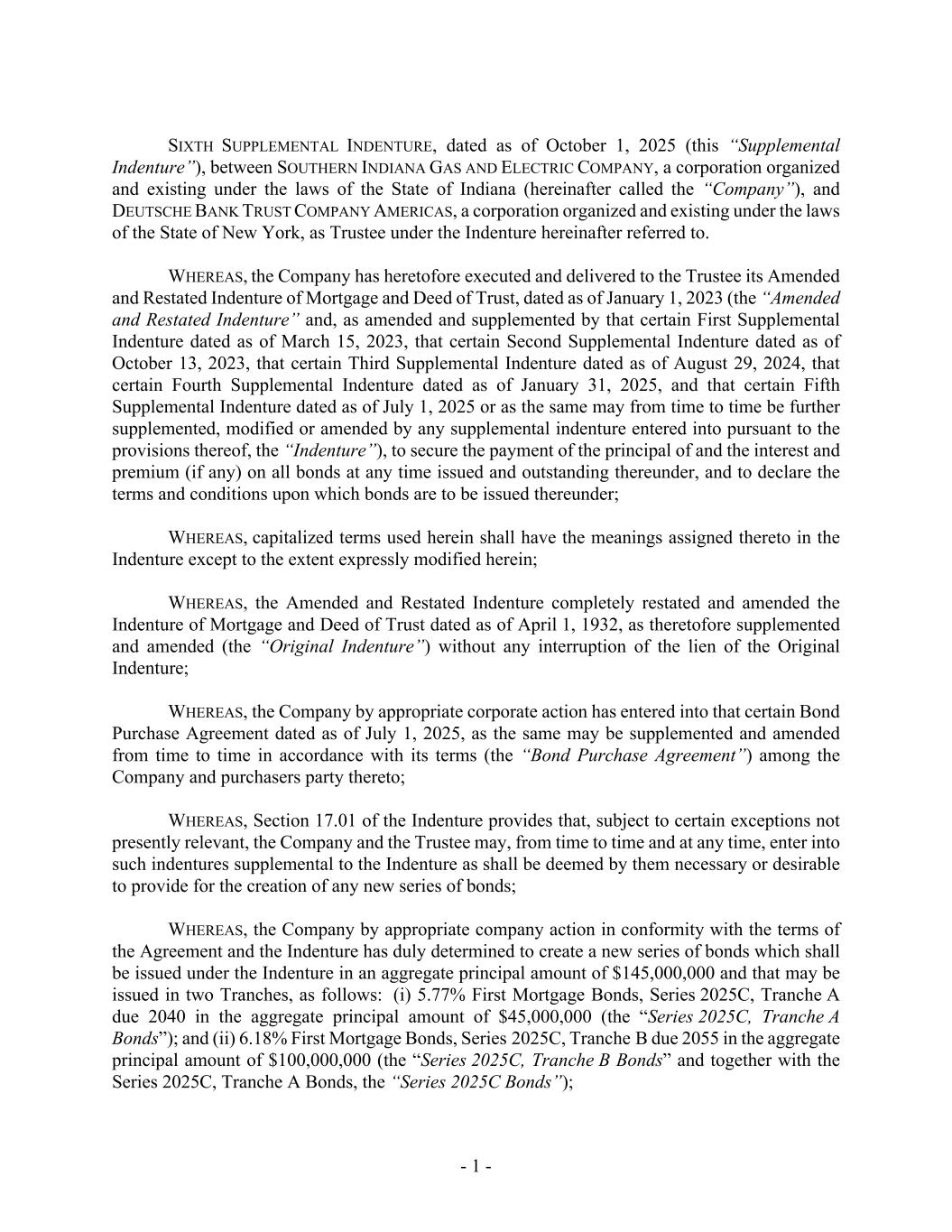 - 1 - SIXTH SUPPLEMENTAL INDENTURE, dated as of October 1, 2025 (this “Supplemental Indenture”), between SOUTHERN INDIANA GAS AND ELECTRIC COMPANY, a corporation organized and existing under the laws of the State of Indiana (hereinafter called the “Company”), and DEUTSCHE BANK TRUST COMPANY AMERICAS, a corporation organized and existing under the laws of the State of New York, as Trustee under the Indenture hereinafter referred to. WHEREAS, the Company has heretofore executed and delivered to the Trustee its Amended and Restated Indenture of Mortgage and Deed of Trust, dated as of January 1, 2023 (the “Amended and Restated Indenture” and, as amended and supplemented by that certain First Supplemental Indenture dated as of March 15, 2023, that certain Second Supplemental Indenture dated as of October 13, 2023, that certain Third Supplemental Indenture dated as of August 29, 2024, that certain Fourth Supplemental Indenture dated as of January 31, 2025, and that certain Fifth Supplemental Indenture dated as of July 1, 2025 or as the same may from time to time be further supplemented, modified or amended by any supplemental indenture entered into pursuant to the provisions thereof, the “Indenture”), to secure the payment of the principal of and the interest and premium (if any) on all bonds at any time issued and outstanding thereunder, and to declare the terms and conditions upon which bonds are to be issued thereunder; WHEREAS, capitalized terms used herein shall have the meanings assigned thereto in the Indenture except to the extent expressly modified herein; WHEREAS, the Amended and Restated Indenture completely restated and amended the Indenture of Mortgage and Deed of Trust dated as of April 1, 1932, as theretofore supplemented and amended (the “Original Indenture”) without any interruption of the lien of the Original Indenture; WHEREAS, the Company by appropriate corporate action has entered into that certain Bond Purchase Agreement dated as of July 1, 2025, as the same may be supplemented and amended from time to time in accordance with its terms (the “Bond Purchase Agreement”) among the Company and purchasers party thereto; WHEREAS, Section 17.01 of the Indenture provides that, subject to certain exceptions not presently relevant, the Company and the Trustee may, from time to time and at any time, enter into such indentures supplemental to the Indenture as shall be deemed by them necessary or desirable to provide for the creation of any new series of bonds; WHEREAS, the Company by appropriate company action in conformity with the terms of the Agreement and the Indenture has duly determined to create a new series of bonds which shall be issued under the Indenture in an aggregate principal amount of $145,000,000 and that may be issued in two Tranches, as follows: (i) 5.77% First Mortgage Bonds, Series 2025C, Tranche A due 2040 in the aggregate principal amount of $45,000,000 (the “Series 2025C, Tranche A Bonds”); and (ii) 6.18% First Mortgage Bonds, Series 2025C, Tranche B due 2055 in the aggregate principal amount of $100,000,000 (the “Series 2025C, Tranche B Bonds” and together with the Series 2025C, Tranche A Bonds, the “Series 2025C Bonds”);
