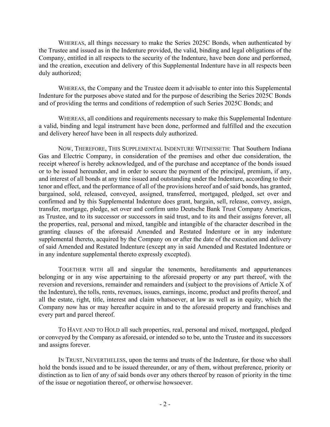 - 2 - WHEREAS, all things necessary to make the Series 2025C Bonds, when authenticated by the Trustee and issued as in the Indenture provided, the valid, binding and legal obligations of the Company, entitled in all respects to the security of the Indenture, have been done and performed, and the creation, execution and delivery of this Supplemental Indenture have in all respects been duly authorized; WHEREAS, the Company and the Trustee deem it advisable to enter into this Supplemental Indenture for the purposes above stated and for the purpose of describing the Series 2025C Bonds and of providing the terms and conditions of redemption of such Series 2025C Bonds; and WHEREAS, all conditions and requirements necessary to make this Supplemental Indenture a valid, binding and legal instrument have been done, performed and fulfilled and the execution and delivery hereof have been in all respects duly authorized. NOW, THEREFORE, THIS SUPPLEMENTAL INDENTURE WITNESSETH: That Southern Indiana Gas and Electric Company, in consideration of the premises and other due consideration, the receipt whereof is hereby acknowledged, and of the purchase and acceptance of the bonds issued or to be issued hereunder, and in order to secure the payment of the principal, premium, if any, and interest of all bonds at any time issued and outstanding under the Indenture, according to their tenor and effect, and the performance of all of the provisions hereof and of said bonds, has granted, bargained, sold, released, conveyed, assigned, transferred, mortgaged, pledged, set over and confirmed and by this Supplemental Indenture does grant, bargain, sell, release, convey, assign, transfer, mortgage, pledge, set over and confirm unto Deutsche Bank Trust Company Americas, as Trustee, and to its successor or successors in said trust, and to its and their assigns forever, all the properties, real, personal and mixed, tangible and intangible of the character described in the granting clauses of the aforesaid Amended and Restated Indenture or in any indenture supplemental thereto, acquired by the Company on or after the date of the execution and delivery of said Amended and Restated Indenture (except any in said Amended and Restated Indenture or in any indenture supplemental thereto expressly excepted). TOGETHER WITH all and singular the tenements, hereditaments and appurtenances belonging or in any wise appertaining to the aforesaid property or any part thereof, with the reversion and reversions, remainder and remainders and (subject to the provisions of Article X of the Indenture), the tolls, rents, revenues, issues, earnings, income, product and profits thereof, and all the estate, right, title, interest and claim whatsoever, at law as well as in equity, which the Company now has or may hereafter acquire in and to the aforesaid property and franchises and every part and parcel thereof. TO HAVE AND TO HOLD all such properties, real, personal and mixed, mortgaged, pledged or conveyed by the Company as aforesaid, or intended so to be, unto the Trustee and its successors and assigns forever. IN TRUST, NEVERTHELESS, upon the terms and trusts of the Indenture, for those who shall hold the bonds issued and to be issued thereunder, or any of them, without preference, priority or distinction as to lien of any of said bonds over any others thereof by reason of priority in the time of the issue or negotiation thereof, or otherwise howsoever.