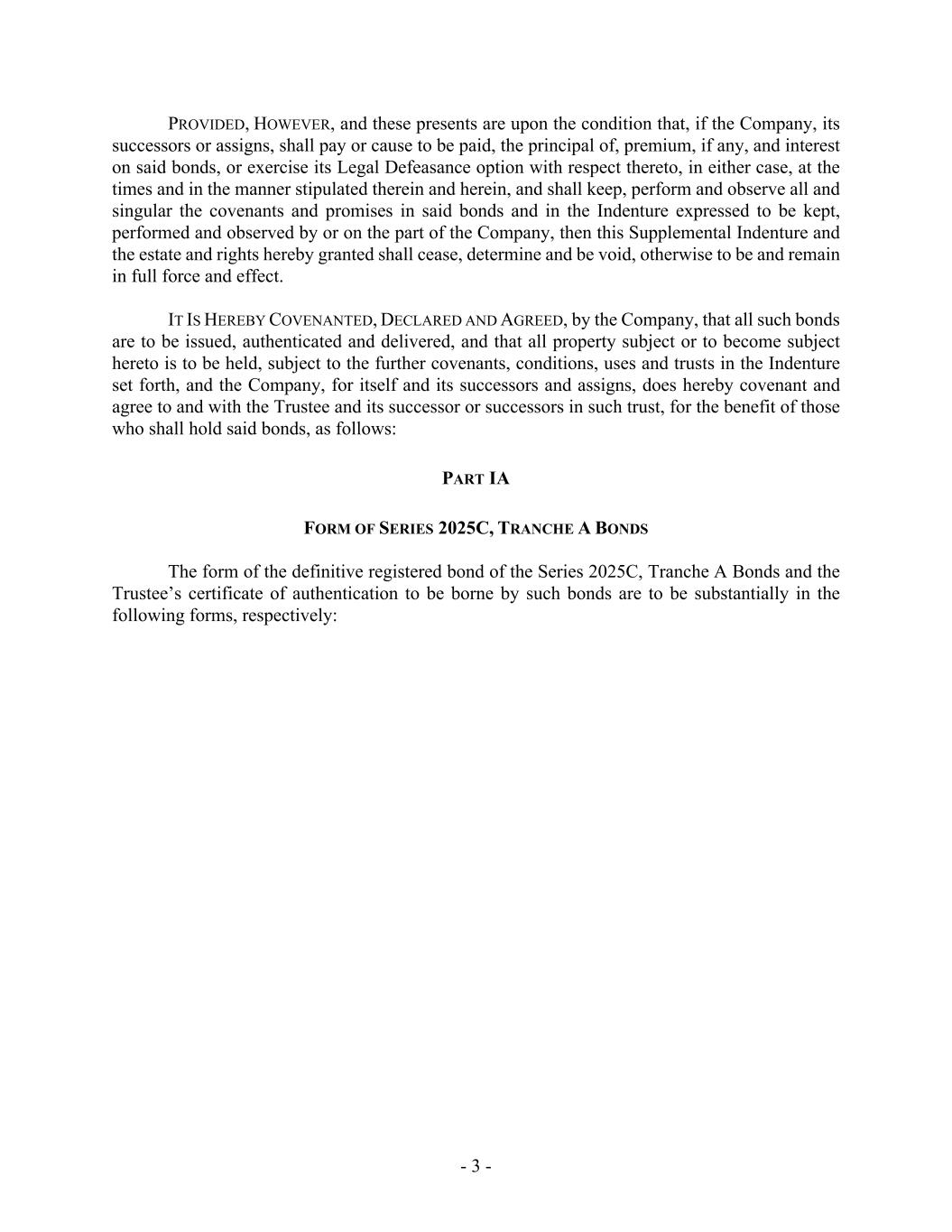 - 3 - PROVIDED, HOWEVER, and these presents are upon the condition that, if the Company, its successors or assigns, shall pay or cause to be paid, the principal of, premium, if any, and interest on said bonds, or exercise its Legal Defeasance option with respect thereto, in either case, at the times and in the manner stipulated therein and herein, and shall keep, perform and observe all and singular the covenants and promises in said bonds and in the Indenture expressed to be kept, performed and observed by or on the part of the Company, then this Supplemental Indenture and the estate and rights hereby granted shall cease, determine and be void, otherwise to be and remain in full force and effect. IT IS HEREBY COVENANTED, DECLARED AND AGREED, by the Company, that all such bonds are to be issued, authenticated and delivered, and that all property subject or to become subject hereto is to be held, subject to the further covenants, conditions, uses and trusts in the Indenture set forth, and the Company, for itself and its successors and assigns, does hereby covenant and agree to and with the Trustee and its successor or successors in such trust, for the benefit of those who shall hold said bonds, as follows: PART IA FORM OF SERIES 2025C, TRANCHE A BONDS The form of the definitive registered bond of the Series 2025C, Tranche A Bonds and the Trustee’s certificate of authentication to be borne by such bonds are to be substantially in the following forms, respectively: