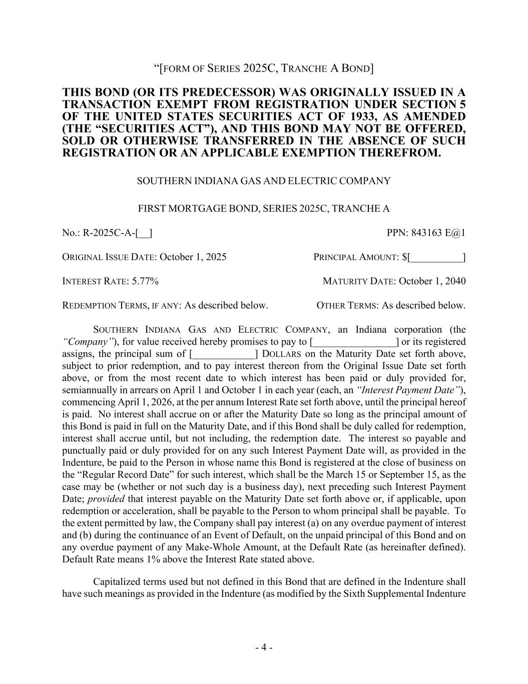 - 4 - “[FORM OF SERIES 2025C, TRANCHE A BOND] THIS BOND (OR ITS PREDECESSOR) WAS ORIGINALLY ISSUED IN A TRANSACTION EXEMPT FROM REGISTRATION UNDER SECTION 5 OF THE UNITED STATES SECURITIES ACT OF 1933, AS AMENDED (THE “SECURITIES ACT”), AND THIS BOND MAY NOT BE OFFERED, SOLD OR OTHERWISE TRANSFERRED IN THE ABSENCE OF SUCH REGISTRATION OR AN APPLICABLE EXEMPTION THEREFROM. SOUTHERN INDIANA GAS AND ELECTRIC COMPANY FIRST MORTGAGE BOND, SERIES 2025C, TRANCHE A No.: R-2025C-A-[__] PPN: 843163 E@1 ORIGINAL ISSUE DATE: October 1, 2025 PRINCIPAL AMOUNT: $[__________] INTEREST RATE: 5.77% MATURITY DATE: October 1, 2040 REDEMPTION TERMS, IF ANY: As described below. OTHER TERMS: As described below. SOUTHERN INDIANA GAS AND ELECTRIC COMPANY, an Indiana corporation (the “Company”), for value received hereby promises to pay to [________________] or its registered assigns, the principal sum of [____________] DOLLARS on the Maturity Date set forth above, subject to prior redemption, and to pay interest thereon from the Original Issue Date set forth above, or from the most recent date to which interest has been paid or duly provided for, semiannually in arrears on April 1 and October 1 in each year (each, an “Interest Payment Date”), commencing April 1, 2026, at the per annum Interest Rate set forth above, until the principal hereof is paid. No interest shall accrue on or after the Maturity Date so long as the principal amount of this Bond is paid in full on the Maturity Date, and if this Bond shall be duly called for redemption, interest shall accrue until, but not including, the redemption date. The interest so payable and punctually paid or duly provided for on any such Interest Payment Date will, as provided in the Indenture, be paid to the Person in whose name this Bond is registered at the close of business on the “Regular Record Date” for such interest, which shall be the March 15 or September 15, as the case may be (whether or not such day is a business day), next preceding such Interest Payment Date; provided that interest payable on the Maturity Date set forth above or, if applicable, upon redemption or acceleration, shall be payable to the Person to whom principal shall be payable. To the extent permitted by law, the Company shall pay interest (a) on any overdue payment of interest and (b) during the continuance of an Event of Default, on the unpaid principal of this Bond and on any overdue payment of any Make-Whole Amount, at the Default Rate (as hereinafter defined). Default Rate means 1% above the Interest Rate stated above. Capitalized terms used but not defined in this Bond that are defined in the Indenture shall have such meanings as provided in the Indenture (as modified by the Sixth Supplemental Indenture