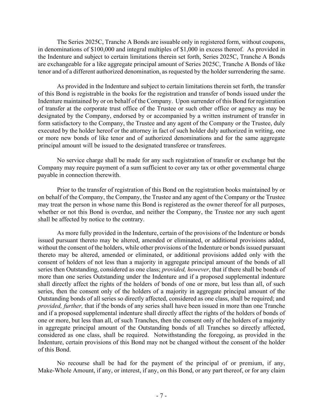 - 7 - The Series 2025C, Tranche A Bonds are issuable only in registered form, without coupons, in denominations of $100,000 and integral multiples of $1,000 in excess thereof. As provided in the Indenture and subject to certain limitations therein set forth, Series 2025C, Tranche A Bonds are exchangeable for a like aggregate principal amount of Series 2025C, Tranche A Bonds of like tenor and of a different authorized denomination, as requested by the holder surrendering the same. As provided in the Indenture and subject to certain limitations therein set forth, the transfer of this Bond is registrable in the books for the registration and transfer of bonds issued under the Indenture maintained by or on behalf of the Company. Upon surrender of this Bond for registration of transfer at the corporate trust office of the Trustee or such other office or agency as may be designated by the Company, endorsed by or accompanied by a written instrument of transfer in form satisfactory to the Company, the Trustee and any agent of the Company or the Trustee, duly executed by the holder hereof or the attorney in fact of such holder duly authorized in writing, one or more new bonds of like tenor and of authorized denominations and for the same aggregate principal amount will be issued to the designated transferee or transferees. No service charge shall be made for any such registration of transfer or exchange but the Company may require payment of a sum sufficient to cover any tax or other governmental charge payable in connection therewith. Prior to the transfer of registration of this Bond on the registration books maintained by or on behalf of the Company, the Company, the Trustee and any agent of the Company or the Trustee may treat the person in whose name this Bond is registered as the owner thereof for all purposes, whether or not this Bond is overdue, and neither the Company, the Trustee nor any such agent shall be affected by notice to the contrary. As more fully provided in the Indenture, certain of the provisions of the Indenture or bonds issued pursuant thereto may be altered, amended or eliminated, or additional provisions added, without the consent of the holders, while other provisions of the Indenture or bonds issued pursuant thereto may be altered, amended or eliminated, or additional provisions added only with the consent of holders of not less than a majority in aggregate principal amount of the bonds of all series then Outstanding, considered as one class; provided, however, that if there shall be bonds of more than one series Outstanding under the Indenture and if a proposed supplemental indenture shall directly affect the rights of the holders of bonds of one or more, but less than all, of such series, then the consent only of the holders of a majority in aggregate principal amount of the Outstanding bonds of all series so directly affected, considered as one class, shall be required; and provided, further, that if the bonds of any series shall have been issued in more than one Tranche and if a proposed supplemental indenture shall directly affect the rights of the holders of bonds of one or more, but less than all, of such Tranches, then the consent only of the holders of a majority in aggregate principal amount of the Outstanding bonds of all Tranches so directly affected, considered as one class, shall be required. Notwithstanding the foregoing, as provided in the Indenture, certain provisions of this Bond may not be changed without the consent of the holder of this Bond. No recourse shall be had for the payment of the principal of or premium, if any, Make-Whole Amount, if any, or interest, if any, on this Bond, or any part thereof, or for any claim