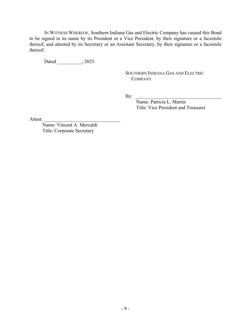 - 9 - IN WITNESS WHEREOF, Southern Indiana Gas and Electric Company has caused this Bond to be signed in its name by its President or a Vice President, by their signature or a facsimile thereof, and attested by its Secretary or an Assistant Secretary, by their signature or a facsimile thereof. Dated __________, 2025. SOUTHERN INDIANA GAS AND ELECTRIC COMPANY By: ___________________________________ Name: Patricia L. Martin Title: Vice President and Treasurer Attest: _______________________________ Name: Vincent A. Mercaldi Title: Corporate Secretary