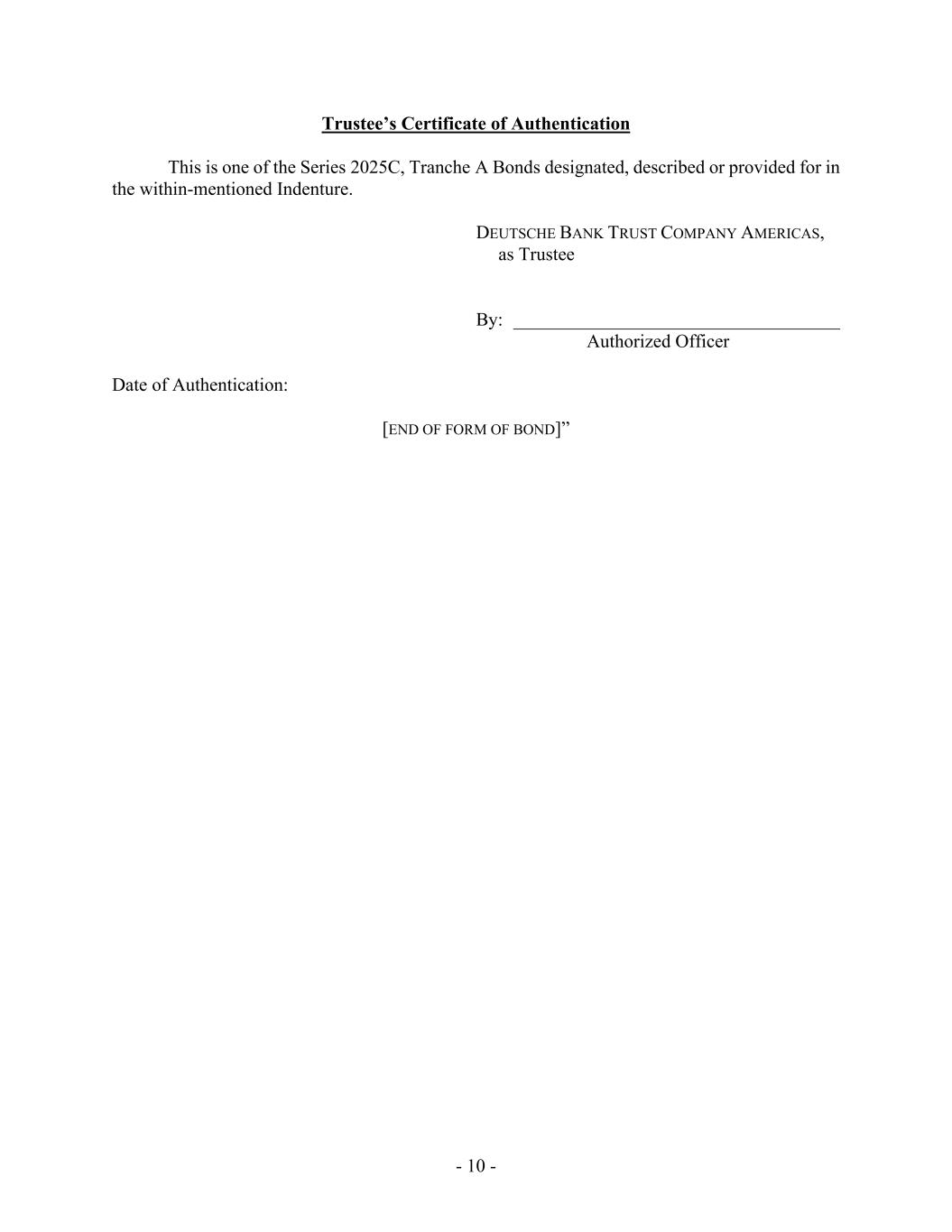 - 10 - Trustee’s Certificate of Authentication This is one of the Series 2025C, Tranche A Bonds designated, described or provided for in the within-mentioned Indenture. DEUTSCHE BANK TRUST COMPANY AMERICAS, as Trustee By: ___________________________________ Authorized Officer Date of Authentication: [END OF FORM OF BOND]”