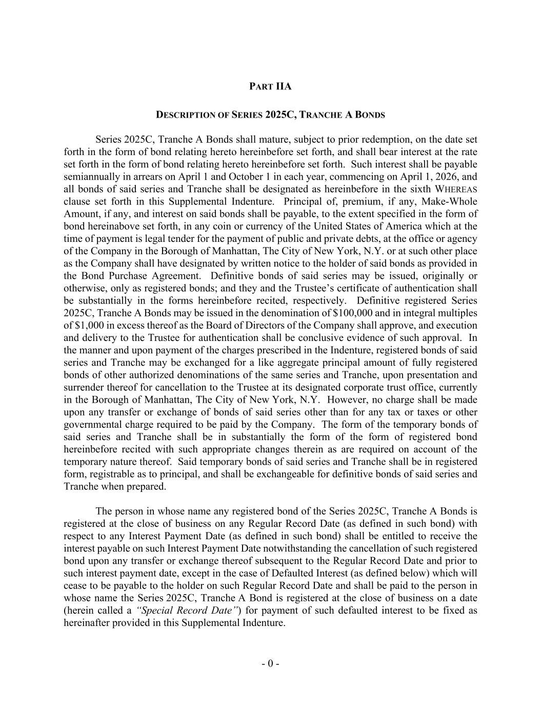 - 0 - PART IIA DESCRIPTION OF SERIES 2025C, TRANCHE A BONDS Series 2025C, Tranche A Bonds shall mature, subject to prior redemption, on the date set forth in the form of bond relating hereto hereinbefore set forth, and shall bear interest at the rate set forth in the form of bond relating hereto hereinbefore set forth. Such interest shall be payable semiannually in arrears on April 1 and October 1 in each year, commencing on April 1, 2026, and all bonds of said series and Tranche shall be designated as hereinbefore in the sixth WHEREAS clause set forth in this Supplemental Indenture. Principal of, premium, if any, Make-Whole Amount, if any, and interest on said bonds shall be payable, to the extent specified in the form of bond hereinabove set forth, in any coin or currency of the United States of America which at the time of payment is legal tender for the payment of public and private debts, at the office or agency of the Company in the Borough of Manhattan, The City of New York, N.Y. or at such other place as the Company shall have designated by written notice to the holder of said bonds as provided in the Bond Purchase Agreement. Definitive bonds of said series may be issued, originally or otherwise, only as registered bonds; and they and the Trustee’s certificate of authentication shall be substantially in the forms hereinbefore recited, respectively. Definitive registered Series 2025C, Tranche A Bonds may be issued in the denomination of $100,000 and in integral multiples of $1,000 in excess thereof as the Board of Directors of the Company shall approve, and execution and delivery to the Trustee for authentication shall be conclusive evidence of such approval. In the manner and upon payment of the charges prescribed in the Indenture, registered bonds of said series and Tranche may be exchanged for a like aggregate principal amount of fully registered bonds of other authorized denominations of the same series and Tranche, upon presentation and surrender thereof for cancellation to the Trustee at its designated corporate trust office, currently in the Borough of Manhattan, The City of New York, N.Y. However, no charge shall be made upon any transfer or exchange of bonds of said series other than for any tax or taxes or other governmental charge required to be paid by the Company. The form of the temporary bonds of said series and Tranche shall be in substantially the form of the form of registered bond hereinbefore recited with such appropriate changes therein as are required on account of the temporary nature thereof. Said temporary bonds of said series and Tranche shall be in registered form, registrable as to principal, and shall be exchangeable for definitive bonds of said series and Tranche when prepared. The person in whose name any registered bond of the Series 2025C, Tranche A Bonds is registered at the close of business on any Regular Record Date (as defined in such bond) with respect to any Interest Payment Date (as defined in such bond) shall be entitled to receive the interest payable on such Interest Payment Date notwithstanding the cancellation of such registered bond upon any transfer or exchange thereof subsequent to the Regular Record Date and prior to such interest payment date, except in the case of Defaulted Interest (as defined below) which will cease to be payable to the holder on such Regular Record Date and shall be paid to the person in whose name the Series 2025C, Tranche A Bond is registered at the close of business on a date (herein called a “Special Record Date”) for payment of such defaulted interest to be fixed as hereinafter provided in this Supplemental Indenture.