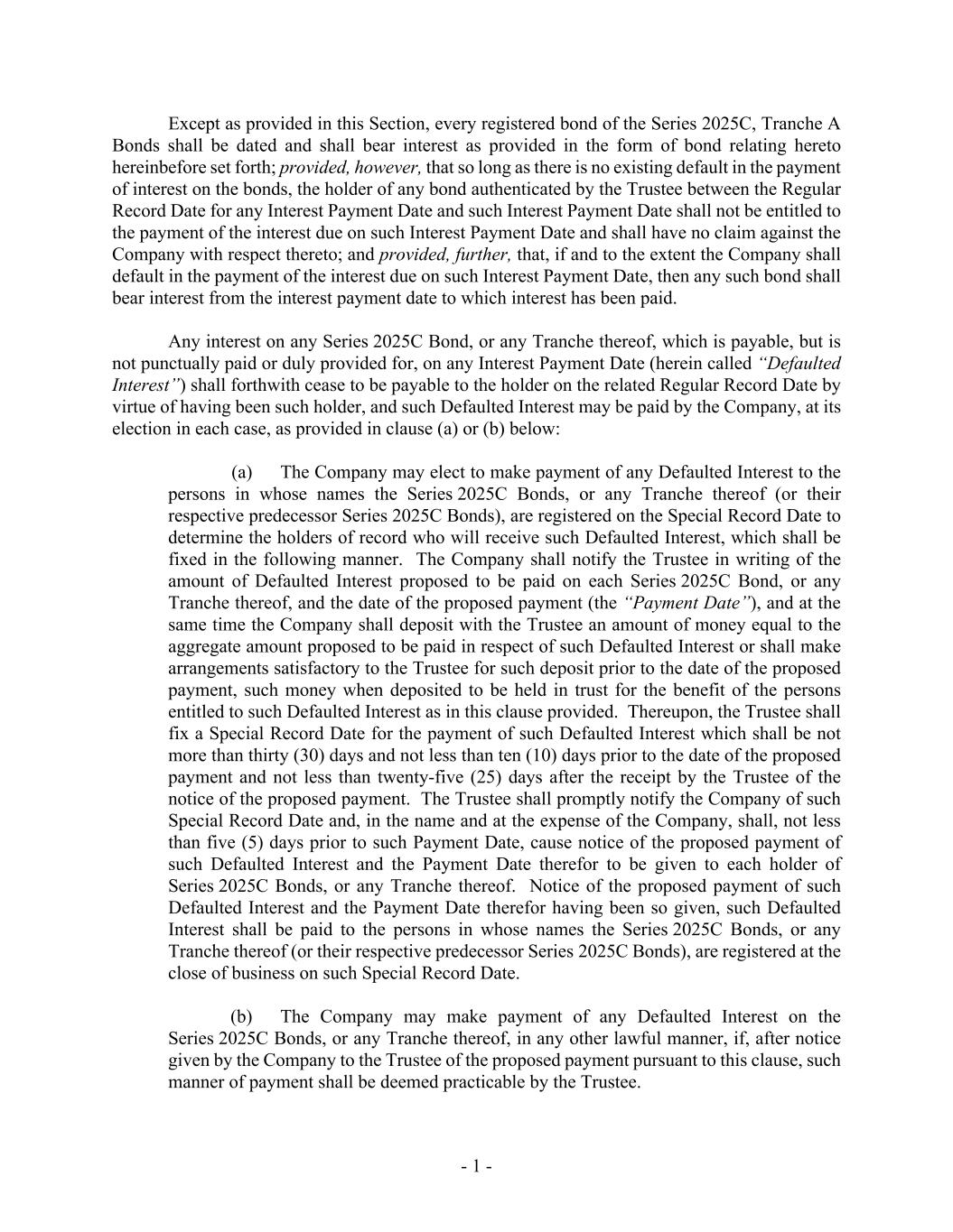 - 1 - Except as provided in this Section, every registered bond of the Series 2025C, Tranche A Bonds shall be dated and shall bear interest as provided in the form of bond relating hereto hereinbefore set forth; provided, however, that so long as there is no existing default in the payment of interest on the bonds, the holder of any bond authenticated by the Trustee between the Regular Record Date for any Interest Payment Date and such Interest Payment Date shall not be entitled to the payment of the interest due on such Interest Payment Date and shall have no claim against the Company with respect thereto; and provided, further, that, if and to the extent the Company shall default in the payment of the interest due on such Interest Payment Date, then any such bond shall bear interest from the interest payment date to which interest has been paid. Any interest on any Series 2025C Bond, or any Tranche thereof, which is payable, but is not punctually paid or duly provided for, on any Interest Payment Date (herein called “Defaulted Interest”) shall forthwith cease to be payable to the holder on the related Regular Record Date by virtue of having been such holder, and such Defaulted Interest may be paid by the Company, at its election in each case, as provided in clause (a) or (b) below: (a) The Company may elect to make payment of any Defaulted Interest to the persons in whose names the Series 2025C Bonds, or any Tranche thereof (or their respective predecessor Series 2025C Bonds), are registered on the Special Record Date to determine the holders of record who will receive such Defaulted Interest, which shall be fixed in the following manner. The Company shall notify the Trustee in writing of the amount of Defaulted Interest proposed to be paid on each Series 2025C Bond, or any Tranche thereof, and the date of the proposed payment (the “Payment Date”), and at the same time the Company shall deposit with the Trustee an amount of money equal to the aggregate amount proposed to be paid in respect of such Defaulted Interest or shall make arrangements satisfactory to the Trustee for such deposit prior to the date of the proposed payment, such money when deposited to be held in trust for the benefit of the persons entitled to such Defaulted Interest as in this clause provided. Thereupon, the Trustee shall fix a Special Record Date for the payment of such Defaulted Interest which shall be not more than thirty (30) days and not less than ten (10) days prior to the date of the proposed payment and not less than twenty-five (25) days after the receipt by the Trustee of the notice of the proposed payment. The Trustee shall promptly notify the Company of such Special Record Date and, in the name and at the expense of the Company, shall, not less than five (5) days prior to such Payment Date, cause notice of the proposed payment of such Defaulted Interest and the Payment Date therefor to be given to each holder of Series 2025C Bonds, or any Tranche thereof. Notice of the proposed payment of such Defaulted Interest and the Payment Date therefor having been so given, such Defaulted Interest shall be paid to the persons in whose names the Series 2025C Bonds, or any Tranche thereof (or their respective predecessor Series 2025C Bonds), are registered at the close of business on such Special Record Date. (b) The Company may make payment of any Defaulted Interest on the Series 2025C Bonds, or any Tranche thereof, in any other lawful manner, if, after notice given by the Company to the Trustee of the proposed payment pursuant to this clause, such manner of payment shall be deemed practicable by the Trustee.