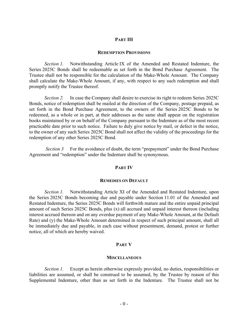 - 0 - PART III REDEMPTION PROVISIONS Section 1. Notwithstanding Article IX of the Amended and Restated Indenture, the Series 2025C Bonds shall be redeemable as set forth in the Bond Purchase Agreement. The Trustee shall not be responsible for the calculation of the Make-Whole Amount. The Company shall calculate the Make-Whole Amount, if any, with respect to any such redemption and shall promptly notify the Trustee thereof. Section 2. In case the Company shall desire to exercise its right to redeem Series 2025C Bonds, notice of redemption shall be mailed at the direction of the Company, postage prepaid, as set forth in the Bond Purchase Agreement, to the owners of the Series 2025C Bonds to be redeemed, as a whole or in part, at their addresses as the same shall appear on the registration books maintained by or on behalf of the Company pursuant to the Indenture as of the most recent practicable date prior to such notice. Failure to duly give notice by mail, or defect in the notice, to the owner of any such Series 2025C Bond shall not affect the validity of the proceedings for the redemption of any other Series 2025C Bond. Section 3 For the avoidance of doubt, the term “prepayment” under the Bond Purchase Agreement and “redemption” under the Indenture shall be synonymous. PART IV REMEDIES ON DEFAULT Section 1. Notwithstanding Article XI of the Amended and Restated Indenture, upon the Series 2025C Bonds becoming due and payable under Section 11.01 of the Amended and Restated Indenture, the Series 2025C Bonds will forthwith mature and the entire unpaid principal amount of such Series 2025C Bonds, plus (x) all accrued and unpaid interest thereon (including interest accrued thereon and on any overdue payment of any Make-Whole Amount, at the Default Rate) and (y) the Make-Whole Amount determined in respect of such principal amount, shall all be immediately due and payable, in each case without presentment, demand, protest or further notice, all of which are hereby waived. PART V MISCELLANEOUS Section 1. Except as herein otherwise expressly provided, no duties, responsibilities or liabilities are assumed, or shall be construed to be assumed, by the Trustee by reason of this Supplemental Indenture, other than as set forth in the Indenture. The Trustee shall not be