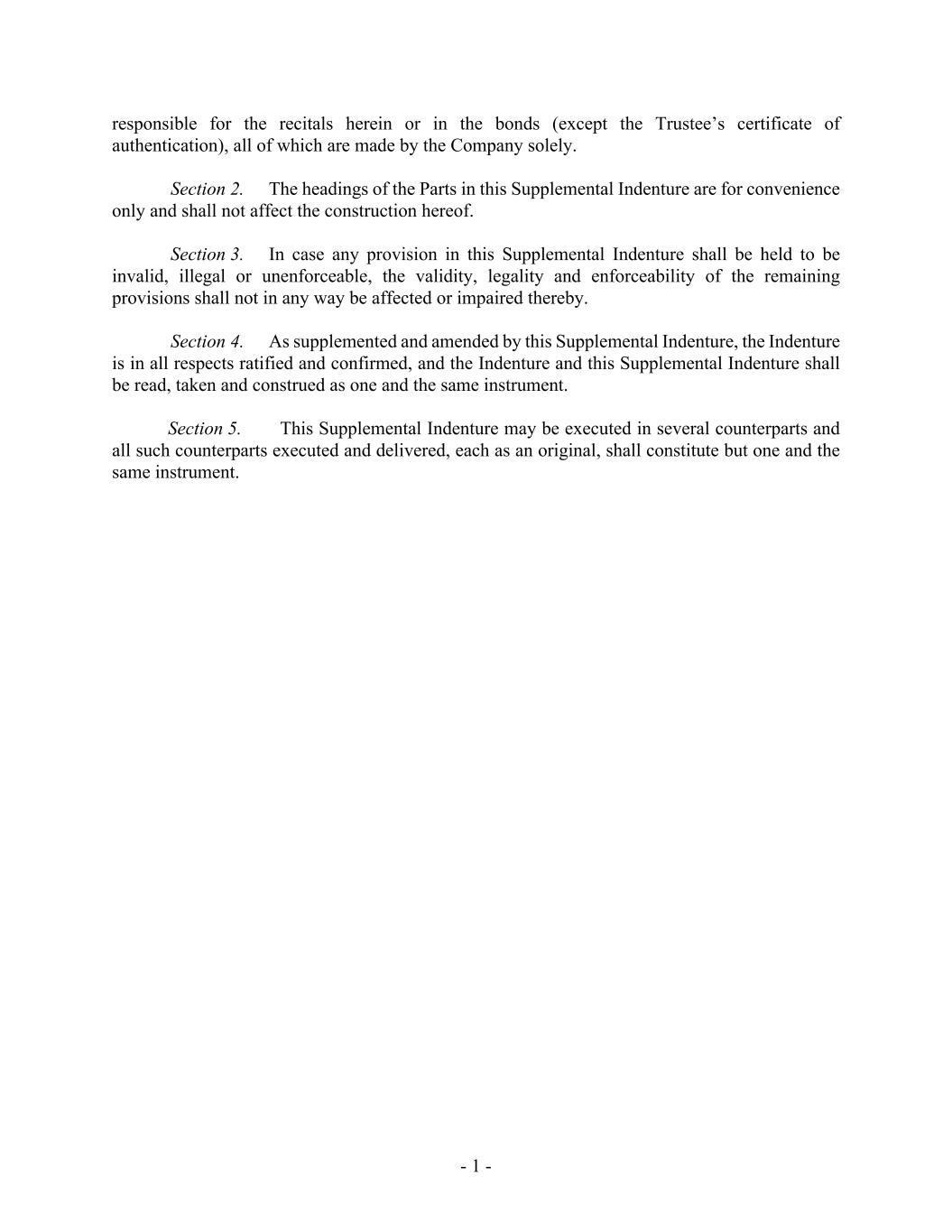 - 1 - responsible for the recitals herein or in the bonds (except the Trustee’s certificate of authentication), all of which are made by the Company solely. Section 2. The headings of the Parts in this Supplemental Indenture are for convenience only and shall not affect the construction hereof. Section 3. In case any provision in this Supplemental Indenture shall be held to be invalid, illegal or unenforceable, the validity, legality and enforceability of the remaining provisions shall not in any way be affected or impaired thereby. Section 4. As supplemented and amended by this Supplemental Indenture, the Indenture is in all respects ratified and confirmed, and the Indenture and this Supplemental Indenture shall be read, taken and construed as one and the same instrument. Section 5. This Supplemental Indenture may be executed in several counterparts and all such counterparts executed and delivered, each as an original, shall constitute but one and the same instrument.