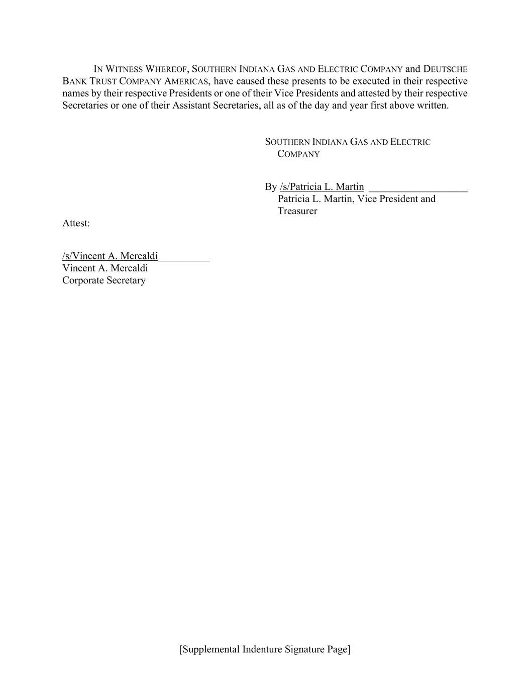 [Supplemental Indenture Signature Page] IN WITNESS WHEREOF, SOUTHERN INDIANA GAS AND ELECTRIC COMPANY and DEUTSCHE BANK TRUST COMPANY AMERICAS, have caused these presents to be executed in their respective names by their respective Presidents or one of their Vice Presidents and attested by their respective Secretaries or one of their Assistant Secretaries, all as of the day and year first above written. SOUTHERN INDIANA GAS AND ELECTRIC COMPANY By /s/Patricia L. Martin ___________________ Patricia L. Martin, Vice President and Treasurer Attest: /s/Vincent A. Mercaldi__________ Vincent A. Mercaldi Corporate Secretary