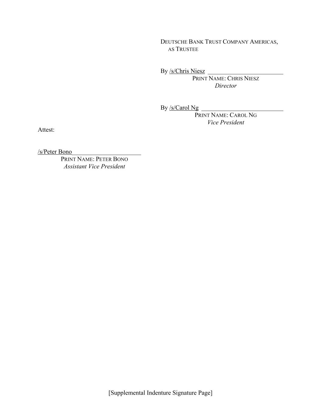 [Supplemental Indenture Signature Page] DEUTSCHE BANK TRUST COMPANY AMERICAS, AS TRUSTEE By /s/Chris Niesz ________________________ PRINT NAME: CHRIS NIESZ Director By /s/Carol Ng __________________________ PRINT NAME: CAROL NG Vice President Attest: /s/Peter Bono______________________ PRINT NAME: PETER BONO Assistant Vice President