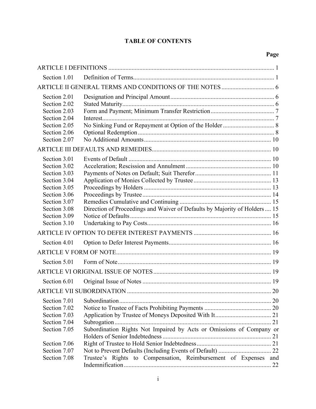 i TABLE OF CONTENTS Page ARTICLE I DEFINITIONS ........................................................................................................... 1 Section 1.01 Definition of Terms........................................................................................... 1 ARTICLE II GENERAL TERMS AND CONDITIONS OF THE NOTES .................................. 6 Section 2.01 Designation and Principal Amount ................................................................... 6 Section 2.02 Stated Maturity.................................................................................................. 6 Section 2.03 Form and Payment; Minimum Transfer Restriction ......................................... 7 Section 2.04 Interest............................................................................................................... 7 Section 2.05 No Sinking Fund or Repayment at Option of the Holder ................................. 8 Section 2.06 Optional Redemption ........................................................................................ 8 Section 2.07 No Additional Amounts .................................................................................. 10 ARTICLE III DEFAULTS AND REMEDIES ............................................................................. 10 Section 3.01 Events of Default ............................................................................................ 10 Section 3.02 Acceleration; Rescission and Annulment ....................................................... 10 Section 3.03 Payments of Notes on Default; Suit Therefor ................................................. 11 Section 3.04 Application of Monies Collected by Trustee .................................................. 13 Section 3.05 Proceedings by Holders .................................................................................. 13 Section 3.06 Proceedings by Trustee ................................................................................... 14 Section 3.07 Remedies Cumulative and Continuing ........................................................... 15 Section 3.08 Direction of Proceedings and Waiver of Defaults by Majority of Holders .... 15 Section 3.09 Notice of Defaults ........................................................................................... 15 Section 3.10 Undertaking to Pay Costs................................................................................ 16 ARTICLE IV OPTION TO DEFER INTEREST PAYMENTS .................................................. 16 Section 4.01 Option to Defer Interest Payments .................................................................. 16 ARTICLE V FORM OF NOTE .................................................................................................... 19 Section 5.01 Form of Note ................................................................................................... 19 ARTICLE VI ORIGINAL ISSUE OF NOTES ............................................................................ 19 Section 6.01 Original Issue of Notes ................................................................................... 19 ARTICLE VII SUBORDINATION ............................................................................................. 20 Section 7.01 Subordination .................................................................................................. 20 Section 7.02 Notice to Trustee of Facts Prohibiting Payments ........................................... 20 Section 7.03 Application by Trustee of Moneys Deposited With It .................................... 21 Section 7.04 Subrogation ..................................................................................................... 21 Section 7.05 Subordination Rights Not Impaired by Acts or Omissions of Company or Holders of Senior Indebtedness ...................................................................... 21 Section 7.06 Right of Trustee to Hold Senior Indebtedness ................................................ 21 Section 7.07 Not to Prevent Defaults (Including Events of Default) .................................. 22 Section 7.08 Trustee’s Rights to Compensation, Reimbursement of Expenses and Indemnification ............................................................................................... 22