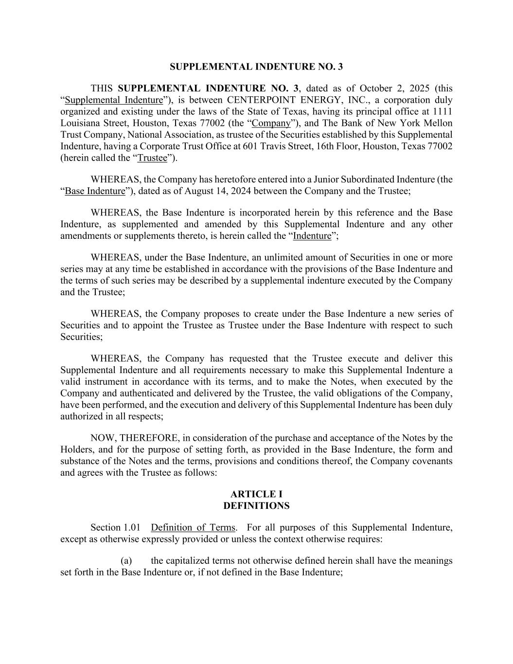 SUPPLEMENTAL INDENTURE NO. 3 THIS SUPPLEMENTAL INDENTURE NO. 3, dated as of October 2, 2025 (this “Supplemental Indenture”), is between CENTERPOINT ENERGY, INC., a corporation duly organized and existing under the laws of the State of Texas, having its principal office at 1111 Louisiana Street, Houston, Texas 77002 (the “Company”), and The Bank of New York Mellon Trust Company, National Association, as trustee of the Securities established by this Supplemental Indenture, having a Corporate Trust Office at 601 Travis Street, 16th Floor, Houston, Texas 77002 (herein called the “Trustee”). WHEREAS, the Company has heretofore entered into a Junior Subordinated Indenture (the “Base Indenture”), dated as of August 14, 2024 between the Company and the Trustee; WHEREAS, the Base Indenture is incorporated herein by this reference and the Base Indenture, as supplemented and amended by this Supplemental Indenture and any other amendments or supplements thereto, is herein called the “Indenture”; WHEREAS, under the Base Indenture, an unlimited amount of Securities in one or more series may at any time be established in accordance with the provisions of the Base Indenture and the terms of such series may be described by a supplemental indenture executed by the Company and the Trustee; WHEREAS, the Company proposes to create under the Base Indenture a new series of Securities and to appoint the Trustee as Trustee under the Base Indenture with respect to such Securities; WHEREAS, the Company has requested that the Trustee execute and deliver this Supplemental Indenture and all requirements necessary to make this Supplemental Indenture a valid instrument in accordance with its terms, and to make the Notes, when executed by the Company and authenticated and delivered by the Trustee, the valid obligations of the Company, have been performed, and the execution and delivery of this Supplemental Indenture has been duly authorized in all respects; NOW, THEREFORE, in consideration of the purchase and acceptance of the Notes by the Holders, and for the purpose of setting forth, as provided in the Base Indenture, the form and substance of the Notes and the terms, provisions and conditions thereof, the Company covenants and agrees with the Trustee as follows: ARTICLE I DEFINITIONS Section 1.01 Definition of Terms. For all purposes of this Supplemental Indenture, except as otherwise expressly provided or unless the context otherwise requires: (a) the capitalized terms not otherwise defined herein shall have the meanings set forth in the Base Indenture or, if not defined in the Base Indenture;