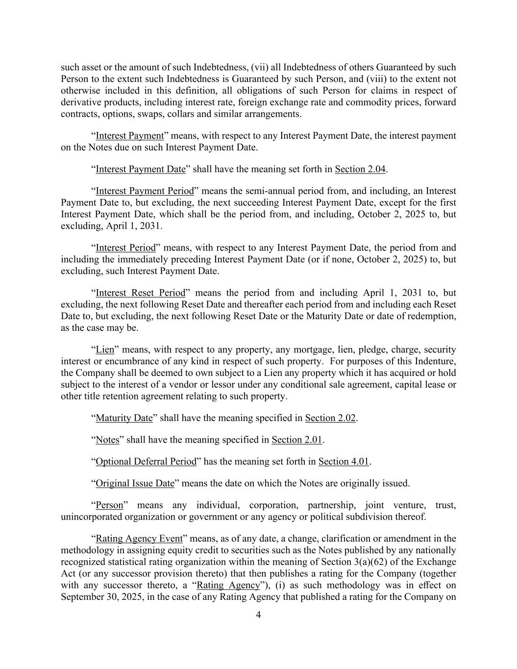 4 such asset or the amount of such Indebtedness, (vii) all Indebtedness of others Guaranteed by such Person to the extent such Indebtedness is Guaranteed by such Person, and (viii) to the extent not otherwise included in this definition, all obligations of such Person for claims in respect of derivative products, including interest rate, foreign exchange rate and commodity prices, forward contracts, options, swaps, collars and similar arrangements. “Interest Payment” means, with respect to any Interest Payment Date, the interest payment on the Notes due on such Interest Payment Date. “Interest Payment Date” shall have the meaning set forth in Section 2.04. “Interest Payment Period” means the semi-annual period from, and including, an Interest Payment Date to, but excluding, the next succeeding Interest Payment Date, except for the first Interest Payment Date, which shall be the period from, and including, October 2, 2025 to, but excluding, April 1, 2031. “Interest Period” means, with respect to any Interest Payment Date, the period from and including the immediately preceding Interest Payment Date (or if none, October 2, 2025) to, but excluding, such Interest Payment Date. “Interest Reset Period” means the period from and including April 1, 2031 to, but excluding, the next following Reset Date and thereafter each period from and including each Reset Date to, but excluding, the next following Reset Date or the Maturity Date or date of redemption, as the case may be. “Lien” means, with respect to any property, any mortgage, lien, pledge, charge, security interest or encumbrance of any kind in respect of such property. For purposes of this Indenture, the Company shall be deemed to own subject to a Lien any property which it has acquired or hold subject to the interest of a vendor or lessor under any conditional sale agreement, capital lease or other title retention agreement relating to such property. “Maturity Date” shall have the meaning specified in Section 2.02. “Notes” shall have the meaning specified in Section 2.01. “Optional Deferral Period” has the meaning set forth in Section 4.01. “Original Issue Date” means the date on which the Notes are originally issued. “Person” means any individual, corporation, partnership, joint venture, trust, unincorporated organization or government or any agency or political subdivision thereof. “Rating Agency Event” means, as of any date, a change, clarification or amendment in the methodology in assigning equity credit to securities such as the Notes published by any nationally recognized statistical rating organization within the meaning of Section 3(a)(62) of the Exchange Act (or any successor provision thereto) that then publishes a rating for the Company (together with any successor thereto, a “Rating Agency”), (i) as such methodology was in effect on September 30, 2025, in the case of any Rating Agency that published a rating for the Company on