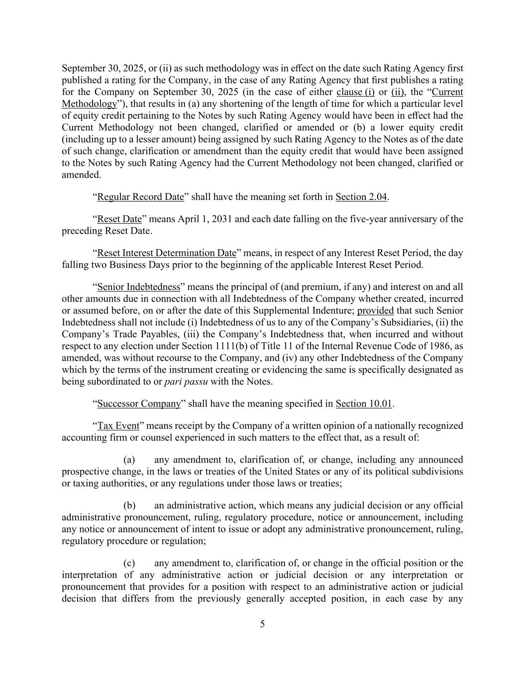 5 September 30, 2025, or (ii) as such methodology was in effect on the date such Rating Agency first published a rating for the Company, in the case of any Rating Agency that first publishes a rating for the Company on September 30, 2025 (in the case of either clause (i) or (ii), the “Current Methodology”), that results in (a) any shortening of the length of time for which a particular level of equity credit pertaining to the Notes by such Rating Agency would have been in effect had the Current Methodology not been changed, clarified or amended or (b) a lower equity credit (including up to a lesser amount) being assigned by such Rating Agency to the Notes as of the date of such change, clarification or amendment than the equity credit that would have been assigned to the Notes by such Rating Agency had the Current Methodology not been changed, clarified or amended. “Regular Record Date” shall have the meaning set forth in Section 2.04. “Reset Date” means April 1, 2031 and each date falling on the five-year anniversary of the preceding Reset Date. “Reset Interest Determination Date” means, in respect of any Interest Reset Period, the day falling two Business Days prior to the beginning of the applicable Interest Reset Period. “Senior Indebtedness” means the principal of (and premium, if any) and interest on and all other amounts due in connection with all Indebtedness of the Company whether created, incurred or assumed before, on or after the date of this Supplemental Indenture; provided that such Senior Indebtedness shall not include (i) Indebtedness of us to any of the Company’s Subsidiaries, (ii) the Company’s Trade Payables, (iii) the Company’s Indebtedness that, when incurred and without respect to any election under Section 1111(b) of Title 11 of the Internal Revenue Code of 1986, as amended, was without recourse to the Company, and (iv) any other Indebtedness of the Company which by the terms of the instrument creating or evidencing the same is specifically designated as being subordinated to or pari passu with the Notes. “Successor Company” shall have the meaning specified in Section 10.01. “Tax Event” means receipt by the Company of a written opinion of a nationally recognized accounting firm or counsel experienced in such matters to the effect that, as a result of: (a) any amendment to, clarification of, or change, including any announced prospective change, in the laws or treaties of the United States or any of its political subdivisions or taxing authorities, or any regulations under those laws or treaties; (b) an administrative action, which means any judicial decision or any official administrative pronouncement, ruling, regulatory procedure, notice or announcement, including any notice or announcement of intent to issue or adopt any administrative pronouncement, ruling, regulatory procedure or regulation; (c) any amendment to, clarification of, or change in the official position or the interpretation of any administrative action or judicial decision or any interpretation or pronouncement that provides for a position with respect to an administrative action or judicial decision that differs from the previously generally accepted position, in each case by any