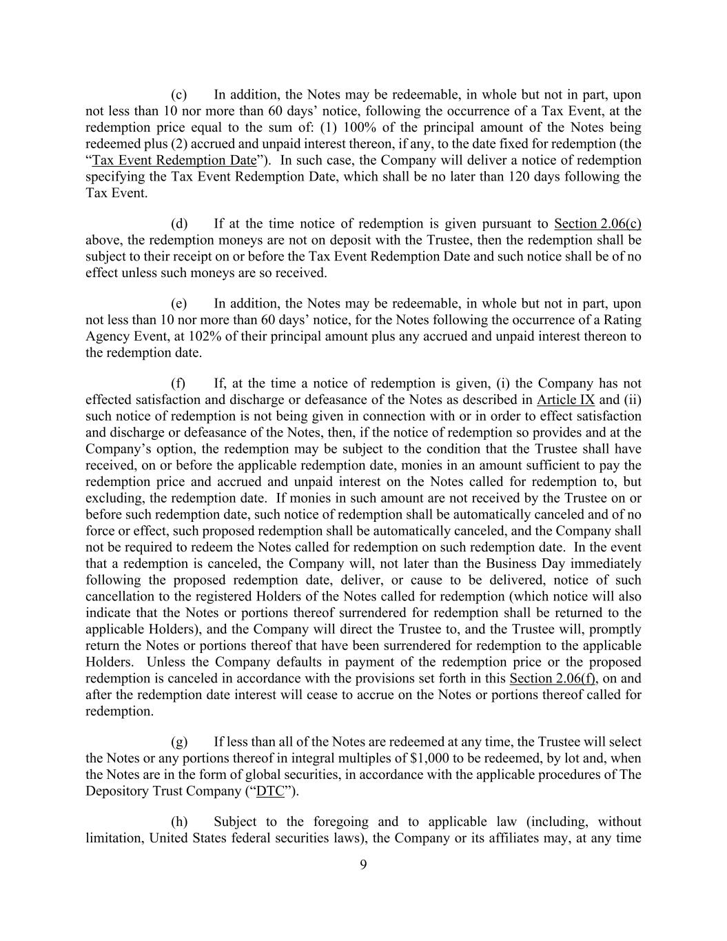 9 (c) In addition, the Notes may be redeemable, in whole but not in part, upon not less than 10 nor more than 60 days’ notice, following the occurrence of a Tax Event, at the redemption price equal to the sum of: (1) 100% of the principal amount of the Notes being redeemed plus (2) accrued and unpaid interest thereon, if any, to the date fixed for redemption (the “Tax Event Redemption Date”). In such case, the Company will deliver a notice of redemption specifying the Tax Event Redemption Date, which shall be no later than 120 days following the Tax Event. (d) If at the time notice of redemption is given pursuant to Section 2.06(c) above, the redemption moneys are not on deposit with the Trustee, then the redemption shall be subject to their receipt on or before the Tax Event Redemption Date and such notice shall be of no effect unless such moneys are so received. (e) In addition, the Notes may be redeemable, in whole but not in part, upon not less than 10 nor more than 60 days’ notice, for the Notes following the occurrence of a Rating Agency Event, at 102% of their principal amount plus any accrued and unpaid interest thereon to the redemption date. (f) If, at the time a notice of redemption is given, (i) the Company has not effected satisfaction and discharge or defeasance of the Notes as described in Article IX and (ii) such notice of redemption is not being given in connection with or in order to effect satisfaction and discharge or defeasance of the Notes, then, if the notice of redemption so provides and at the Company’s option, the redemption may be subject to the condition that the Trustee shall have received, on or before the applicable redemption date, monies in an amount sufficient to pay the redemption price and accrued and unpaid interest on the Notes called for redemption to, but excluding, the redemption date. If monies in such amount are not received by the Trustee on or before such redemption date, such notice of redemption shall be automatically canceled and of no force or effect, such proposed redemption shall be automatically canceled, and the Company shall not be required to redeem the Notes called for redemption on such redemption date. In the event that a redemption is canceled, the Company will, not later than the Business Day immediately following the proposed redemption date, deliver, or cause to be delivered, notice of such cancellation to the registered Holders of the Notes called for redemption (which notice will also indicate that the Notes or portions thereof surrendered for redemption shall be returned to the applicable Holders), and the Company will direct the Trustee to, and the Trustee will, promptly return the Notes or portions thereof that have been surrendered for redemption to the applicable Holders. Unless the Company defaults in payment of the redemption price or the proposed redemption is canceled in accordance with the provisions set forth in this Section 2.06(f), on and after the redemption date interest will cease to accrue on the Notes or portions thereof called for redemption. (g) If less than all of the Notes are redeemed at any time, the Trustee will select the Notes or any portions thereof in integral multiples of $1,000 to be redeemed, by lot and, when the Notes are in the form of global securities, in accordance with the applicable procedures of The Depository Trust Company (“DTC”). (h) Subject to the foregoing and to applicable law (including, without limitation, United States federal securities laws), the Company or its affiliates may, at any time