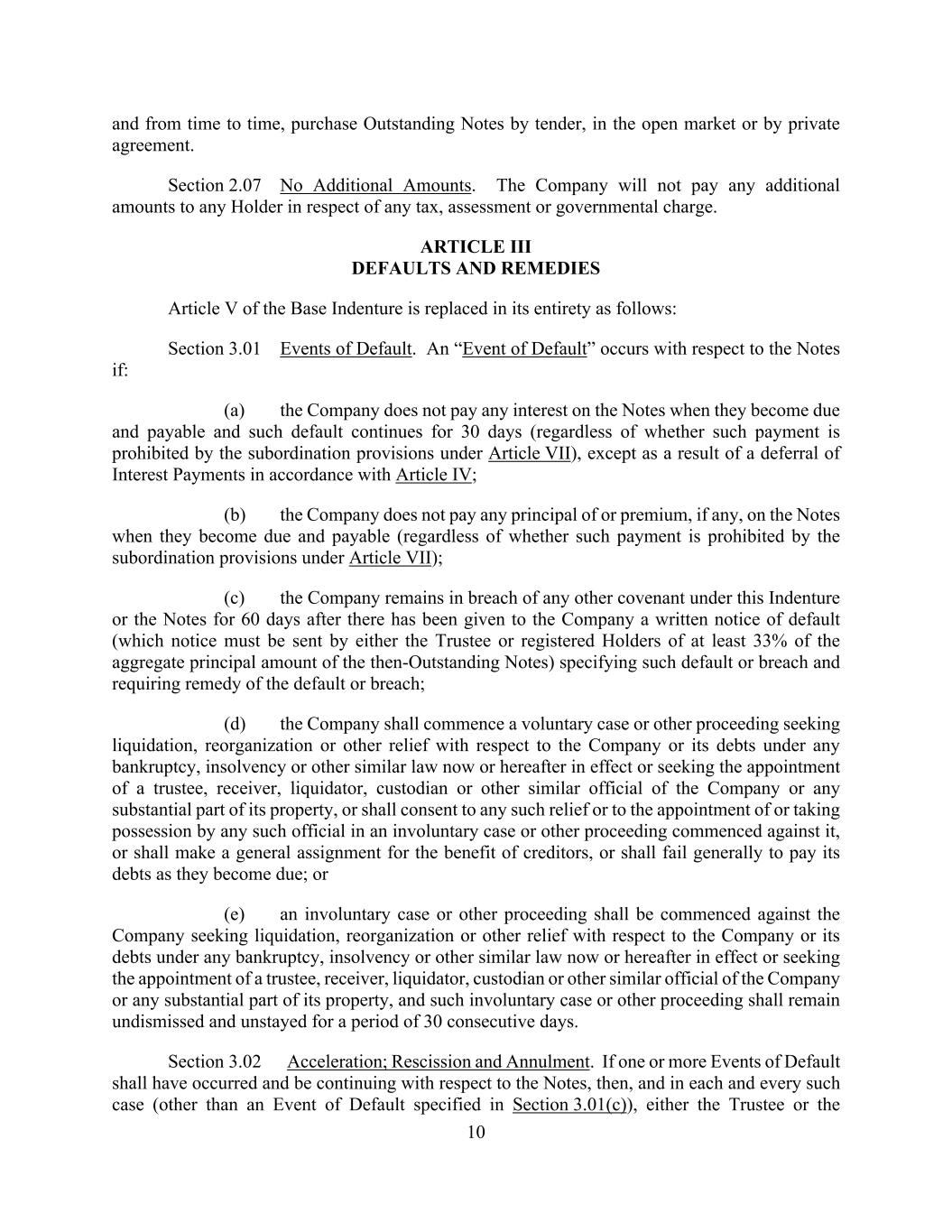 10 and from time to time, purchase Outstanding Notes by tender, in the open market or by private agreement. Section 2.07 No Additional Amounts. The Company will not pay any additional amounts to any Holder in respect of any tax, assessment or governmental charge. ARTICLE III DEFAULTS AND REMEDIES Article V of the Base Indenture is replaced in its entirety as follows: Section 3.01 Events of Default. An “Event of Default” occurs with respect to the Notes if: (a) the Company does not pay any interest on the Notes when they become due and payable and such default continues for 30 days (regardless of whether such payment is prohibited by the subordination provisions under Article VII), except as a result of a deferral of Interest Payments in accordance with Article IV; (b) the Company does not pay any principal of or premium, if any, on the Notes when they become due and payable (regardless of whether such payment is prohibited by the subordination provisions under Article VII); (c) the Company remains in breach of any other covenant under this Indenture or the Notes for 60 days after there has been given to the Company a written notice of default (which notice must be sent by either the Trustee or registered Holders of at least 33% of the aggregate principal amount of the then-Outstanding Notes) specifying such default or breach and requiring remedy of the default or breach; (d) the Company shall commence a voluntary case or other proceeding seeking liquidation, reorganization or other relief with respect to the Company or its debts under any bankruptcy, insolvency or other similar law now or hereafter in effect or seeking the appointment of a trustee, receiver, liquidator, custodian or other similar official of the Company or any substantial part of its property, or shall consent to any such relief or to the appointment of or taking possession by any such official in an involuntary case or other proceeding commenced against it, or shall make a general assignment for the benefit of creditors, or shall fail generally to pay its debts as they become due; or (e) an involuntary case or other proceeding shall be commenced against the Company seeking liquidation, reorganization or other relief with respect to the Company or its debts under any bankruptcy, insolvency or other similar law now or hereafter in effect or seeking the appointment of a trustee, receiver, liquidator, custodian or other similar official of the Company or any substantial part of its property, and such involuntary case or other proceeding shall remain undismissed and unstayed for a period of 30 consecutive days. Section 3.02 Acceleration; Rescission and Annulment. If one or more Events of Default shall have occurred and be continuing with respect to the Notes, then, and in each and every such case (other than an Event of Default specified in Section 3.01(c)), either the Trustee or the