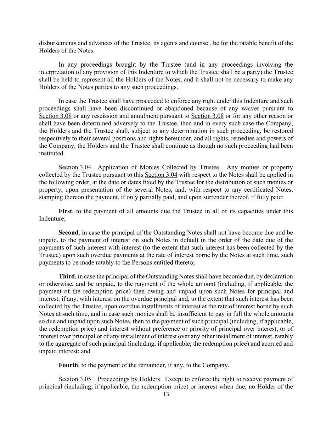13 disbursements and advances of the Trustee, its agents and counsel, be for the ratable benefit of the Holders of the Notes. In any proceedings brought by the Trustee (and in any proceedings involving the interpretation of any provision of this Indenture to which the Trustee shall be a party) the Trustee shall be held to represent all the Holders of the Notes, and it shall not be necessary to make any Holders of the Notes parties to any such proceedings. In case the Trustee shall have proceeded to enforce any right under this Indenture and such proceedings shall have been discontinued or abandoned because of any waiver pursuant to Section 3.08 or any rescission and annulment pursuant to Section 3.08 or for any other reason or shall have been determined adversely to the Trustee, then and in every such case the Company, the Holders and the Trustee shall, subject to any determination in such proceeding, be restored respectively to their several positions and rights hereunder, and all rights, remedies and powers of the Company, the Holders and the Trustee shall continue as though no such proceeding had been instituted. Section 3.04 Application of Monies Collected by Trustee. Any monies or property collected by the Trustee pursuant to this Section 3.04 with respect to the Notes shall be applied in the following order, at the date or dates fixed by the Trustee for the distribution of such monies or property, upon presentation of the several Notes, and, with respect to any certificated Notes, stamping thereon the payment, if only partially paid, and upon surrender thereof, if fully paid: First, to the payment of all amounts due the Trustee in all of its capacities under this Indenture; Second, in case the principal of the Outstanding Notes shall not have become due and be unpaid, to the payment of interest on such Notes in default in the order of the date due of the payments of such interest with interest (to the extent that such interest has been collected by the Trustee) upon such overdue payments at the rate of interest borne by the Notes at such time, such payments to be made ratably to the Persons entitled thereto; Third, in case the principal of the Outstanding Notes shall have become due, by declaration or otherwise, and be unpaid, to the payment of the whole amount (including, if applicable, the payment of the redemption price) then owing and unpaid upon such Notes for principal and interest, if any, with interest on the overdue principal and, to the extent that such interest has been collected by the Trustee, upon overdue installments of interest at the rate of interest borne by such Notes at such time, and in case such monies shall be insufficient to pay in full the whole amounts so due and unpaid upon such Notes, then to the payment of such principal (including, if applicable, the redemption price) and interest without preference or priority of principal over interest, or of interest over principal or of any installment of interest over any other installment of interest, ratably to the aggregate of such principal (including, if applicable, the redemption price) and accrued and unpaid interest; and Fourth, to the payment of the remainder, if any, to the Company. Section 3.05 Proceedings by Holders. Except to enforce the right to receive payment of principal (including, if applicable, the redemption price) or interest when due, no Holder of the