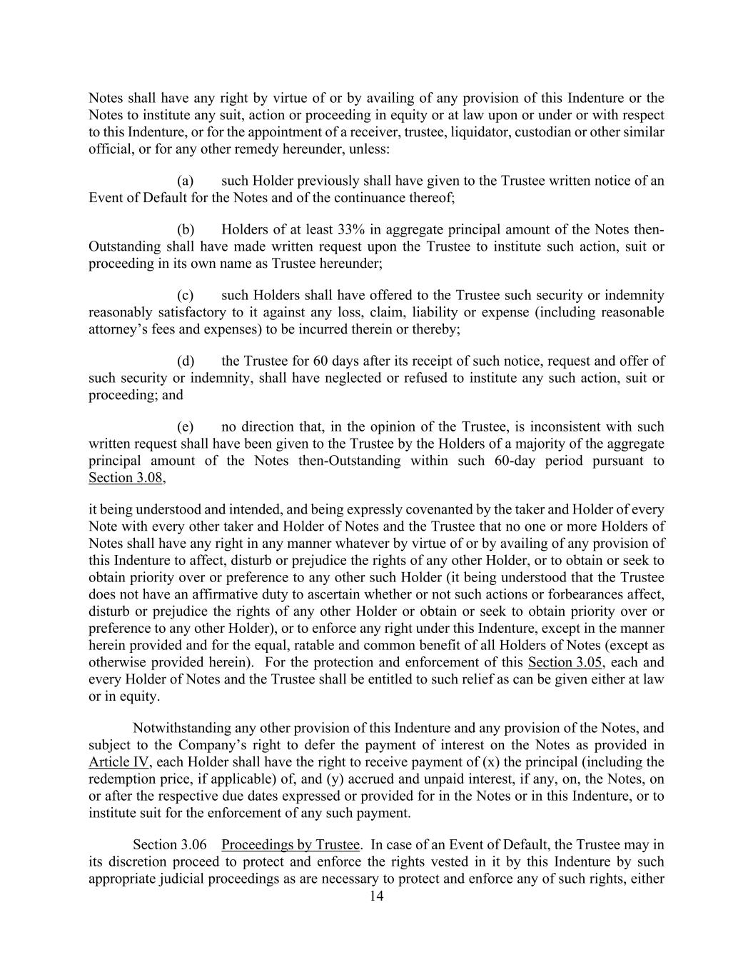 14 Notes shall have any right by virtue of or by availing of any provision of this Indenture or the Notes to institute any suit, action or proceeding in equity or at law upon or under or with respect to this Indenture, or for the appointment of a receiver, trustee, liquidator, custodian or other similar official, or for any other remedy hereunder, unless: (a) such Holder previously shall have given to the Trustee written notice of an Event of Default for the Notes and of the continuance thereof; (b) Holders of at least 33% in aggregate principal amount of the Notes then- Outstanding shall have made written request upon the Trustee to institute such action, suit or proceeding in its own name as Trustee hereunder; (c) such Holders shall have offered to the Trustee such security or indemnity reasonably satisfactory to it against any loss, claim, liability or expense (including reasonable attorney’s fees and expenses) to be incurred therein or thereby; (d) the Trustee for 60 days after its receipt of such notice, request and offer of such security or indemnity, shall have neglected or refused to institute any such action, suit or proceeding; and (e) no direction that, in the opinion of the Trustee, is inconsistent with such written request shall have been given to the Trustee by the Holders of a majority of the aggregate principal amount of the Notes then-Outstanding within such 60-day period pursuant to Section 3.08, it being understood and intended, and being expressly covenanted by the taker and Holder of every Note with every other taker and Holder of Notes and the Trustee that no one or more Holders of Notes shall have any right in any manner whatever by virtue of or by availing of any provision of this Indenture to affect, disturb or prejudice the rights of any other Holder, or to obtain or seek to obtain priority over or preference to any other such Holder (it being understood that the Trustee does not have an affirmative duty to ascertain whether or not such actions or forbearances affect, disturb or prejudice the rights of any other Holder or obtain or seek to obtain priority over or preference to any other Holder), or to enforce any right under this Indenture, except in the manner herein provided and for the equal, ratable and common benefit of all Holders of Notes (except as otherwise provided herein). For the protection and enforcement of this Section 3.05, each and every Holder of Notes and the Trustee shall be entitled to such relief as can be given either at law or in equity. Notwithstanding any other provision of this Indenture and any provision of the Notes, and subject to the Company’s right to defer the payment of interest on the Notes as provided in Article IV, each Holder shall have the right to receive payment of (x) the principal (including the redemption price, if applicable) of, and (y) accrued and unpaid interest, if any, on, the Notes, on or after the respective due dates expressed or provided for in the Notes or in this Indenture, or to institute suit for the enforcement of any such payment. Section 3.06 Proceedings by Trustee. In case of an Event of Default, the Trustee may in its discretion proceed to protect and enforce the rights vested in it by this Indenture by such appropriate judicial proceedings as are necessary to protect and enforce any of such rights, either