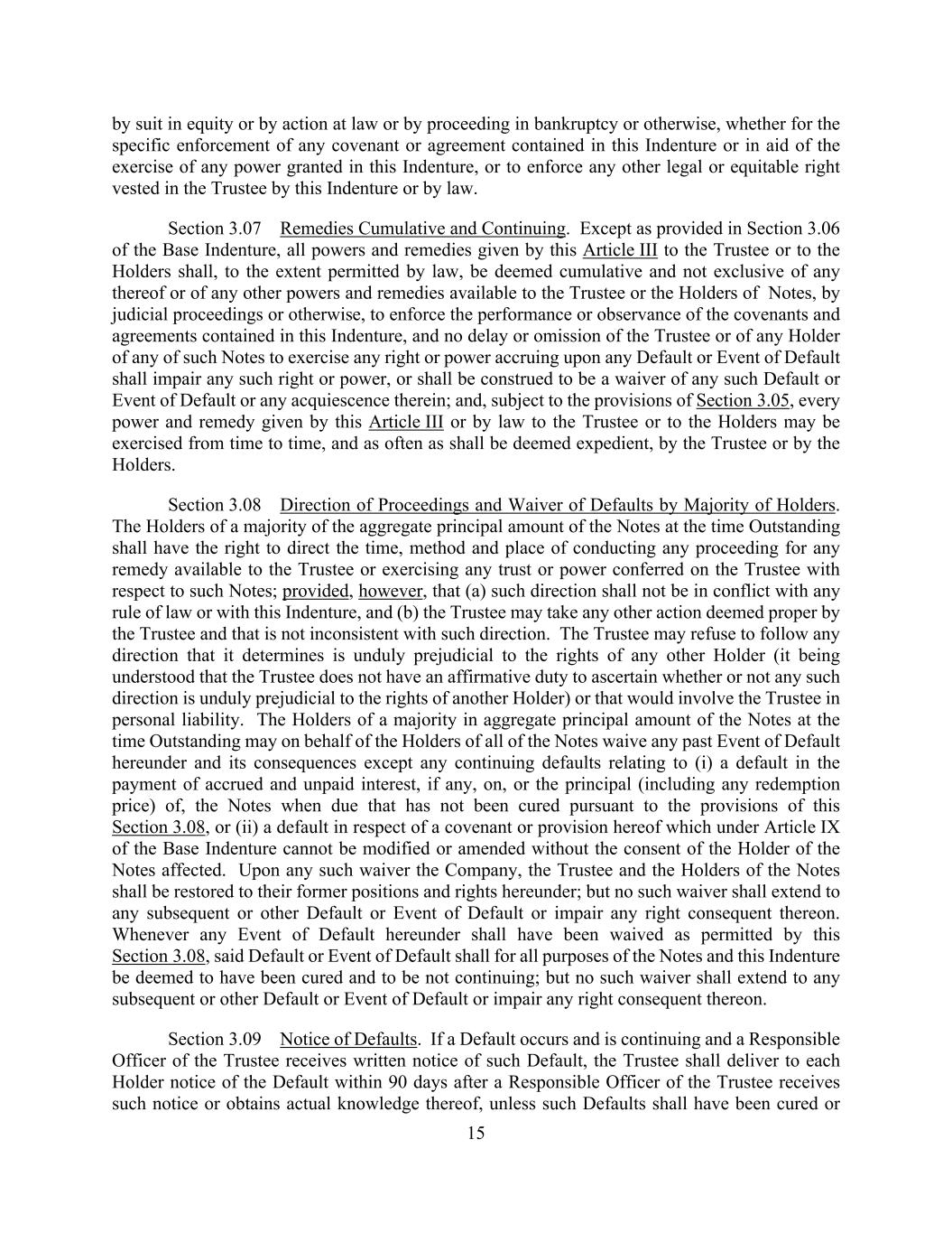 15 by suit in equity or by action at law or by proceeding in bankruptcy or otherwise, whether for the specific enforcement of any covenant or agreement contained in this Indenture or in aid of the exercise of any power granted in this Indenture, or to enforce any other legal or equitable right vested in the Trustee by this Indenture or by law. Section 3.07 Remedies Cumulative and Continuing. Except as provided in Section 3.06 of the Base Indenture, all powers and remedies given by this Article III to the Trustee or to the Holders shall, to the extent permitted by law, be deemed cumulative and not exclusive of any thereof or of any other powers and remedies available to the Trustee or the Holders of Notes, by judicial proceedings or otherwise, to enforce the performance or observance of the covenants and agreements contained in this Indenture, and no delay or omission of the Trustee or of any Holder of any of such Notes to exercise any right or power accruing upon any Default or Event of Default shall impair any such right or power, or shall be construed to be a waiver of any such Default or Event of Default or any acquiescence therein; and, subject to the provisions of Section 3.05, every power and remedy given by this Article III or by law to the Trustee or to the Holders may be exercised from time to time, and as often as shall be deemed expedient, by the Trustee or by the Holders. Section 3.08 Direction of Proceedings and Waiver of Defaults by Majority of Holders. The Holders of a majority of the aggregate principal amount of the Notes at the time Outstanding shall have the right to direct the time, method and place of conducting any proceeding for any remedy available to the Trustee or exercising any trust or power conferred on the Trustee with respect to such Notes; provided, however, that (a) such direction shall not be in conflict with any rule of law or with this Indenture, and (b) the Trustee may take any other action deemed proper by the Trustee and that is not inconsistent with such direction. The Trustee may refuse to follow any direction that it determines is unduly prejudicial to the rights of any other Holder (it being understood that the Trustee does not have an affirmative duty to ascertain whether or not any such direction is unduly prejudicial to the rights of another Holder) or that would involve the Trustee in personal liability. The Holders of a majority in aggregate principal amount of the Notes at the time Outstanding may on behalf of the Holders of all of the Notes waive any past Event of Default hereunder and its consequences except any continuing defaults relating to (i) a default in the payment of accrued and unpaid interest, if any, on, or the principal (including any redemption price) of, the Notes when due that has not been cured pursuant to the provisions of this Section 3.08, or (ii) a default in respect of a covenant or provision hereof which under Article IX of the Base Indenture cannot be modified or amended without the consent of the Holder of the Notes affected. Upon any such waiver the Company, the Trustee and the Holders of the Notes shall be restored to their former positions and rights hereunder; but no such waiver shall extend to any subsequent or other Default or Event of Default or impair any right consequent thereon. Whenever any Event of Default hereunder shall have been waived as permitted by this Section 3.08, said Default or Event of Default shall for all purposes of the Notes and this Indenture be deemed to have been cured and to be not continuing; but no such waiver shall extend to any subsequent or other Default or Event of Default or impair any right consequent thereon. Section 3.09 Notice of Defaults. If a Default occurs and is continuing and a Responsible Officer of the Trustee receives written notice of such Default, the Trustee shall deliver to each Holder notice of the Default within 90 days after a Responsible Officer of the Trustee receives such notice or obtains actual knowledge thereof, unless such Defaults shall have been cured or
