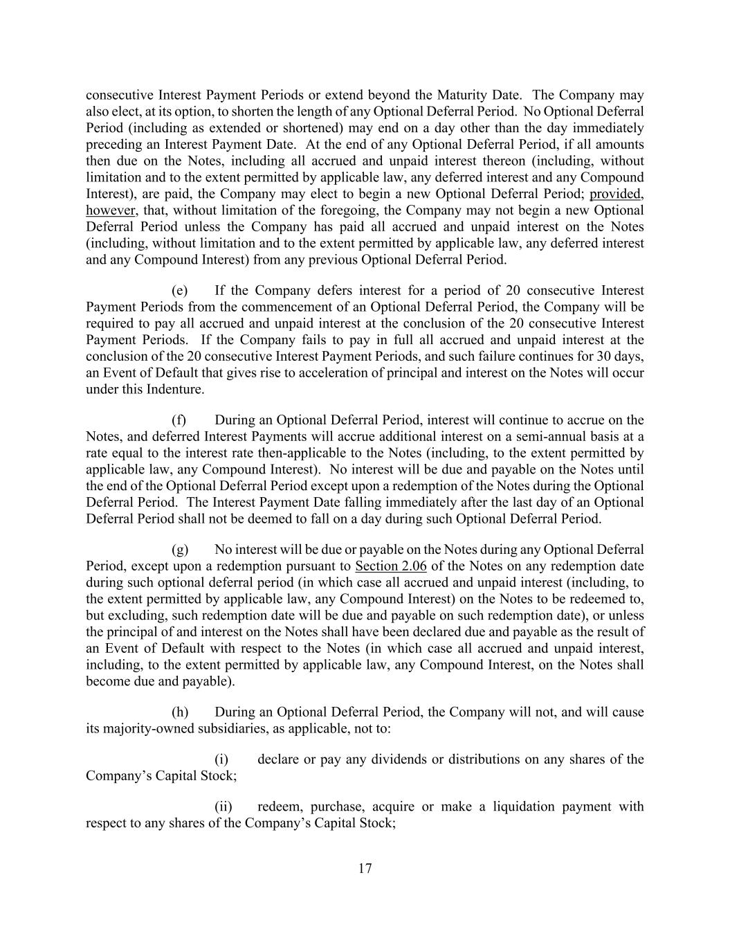 17 consecutive Interest Payment Periods or extend beyond the Maturity Date. The Company may also elect, at its option, to shorten the length of any Optional Deferral Period. No Optional Deferral Period (including as extended or shortened) may end on a day other than the day immediately preceding an Interest Payment Date. At the end of any Optional Deferral Period, if all amounts then due on the Notes, including all accrued and unpaid interest thereon (including, without limitation and to the extent permitted by applicable law, any deferred interest and any Compound Interest), are paid, the Company may elect to begin a new Optional Deferral Period; provided, however, that, without limitation of the foregoing, the Company may not begin a new Optional Deferral Period unless the Company has paid all accrued and unpaid interest on the Notes (including, without limitation and to the extent permitted by applicable law, any deferred interest and any Compound Interest) from any previous Optional Deferral Period. (e) If the Company defers interest for a period of 20 consecutive Interest Payment Periods from the commencement of an Optional Deferral Period, the Company will be required to pay all accrued and unpaid interest at the conclusion of the 20 consecutive Interest Payment Periods. If the Company fails to pay in full all accrued and unpaid interest at the conclusion of the 20 consecutive Interest Payment Periods, and such failure continues for 30 days, an Event of Default that gives rise to acceleration of principal and interest on the Notes will occur under this Indenture. (f) During an Optional Deferral Period, interest will continue to accrue on the Notes, and deferred Interest Payments will accrue additional interest on a semi-annual basis at a rate equal to the interest rate then-applicable to the Notes (including, to the extent permitted by applicable law, any Compound Interest). No interest will be due and payable on the Notes until the end of the Optional Deferral Period except upon a redemption of the Notes during the Optional Deferral Period. The Interest Payment Date falling immediately after the last day of an Optional Deferral Period shall not be deemed to fall on a day during such Optional Deferral Period. (g) No interest will be due or payable on the Notes during any Optional Deferral Period, except upon a redemption pursuant to Section 2.06 of the Notes on any redemption date during such optional deferral period (in which case all accrued and unpaid interest (including, to the extent permitted by applicable law, any Compound Interest) on the Notes to be redeemed to, but excluding, such redemption date will be due and payable on such redemption date), or unless the principal of and interest on the Notes shall have been declared due and payable as the result of an Event of Default with respect to the Notes (in which case all accrued and unpaid interest, including, to the extent permitted by applicable law, any Compound Interest, on the Notes shall become due and payable). (h) During an Optional Deferral Period, the Company will not, and will cause its majority-owned subsidiaries, as applicable, not to: (i) declare or pay any dividends or distributions on any shares of the Company’s Capital Stock; (ii) redeem, purchase, acquire or make a liquidation payment with respect to any shares of the Company’s Capital Stock;