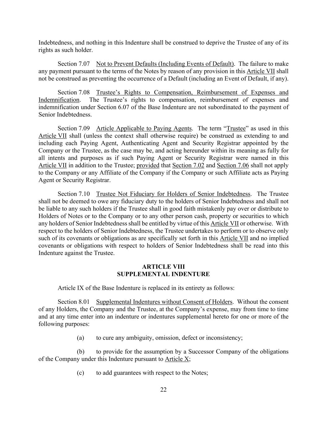 22 Indebtedness, and nothing in this Indenture shall be construed to deprive the Trustee of any of its rights as such holder. Section 7.07 Not to Prevent Defaults (Including Events of Default). The failure to make any payment pursuant to the terms of the Notes by reason of any provision in this Article VII shall not be construed as preventing the occurrence of a Default (including an Event of Default, if any). Section 7.08 Trustee’s Rights to Compensation, Reimbursement of Expenses and Indemnification. The Trustee’s rights to compensation, reimbursement of expenses and indemnification under Section 6.07 of the Base Indenture are not subordinated to the payment of Senior Indebtedness. Section 7.09 Article Applicable to Paying Agents. The term “Trustee” as used in this Article VII shall (unless the context shall otherwise require) be construed as extending to and including each Paying Agent, Authenticating Agent and Security Registrar appointed by the Company or the Trustee, as the case may be, and acting hereunder within its meaning as fully for all intents and purposes as if such Paying Agent or Security Registrar were named in this Article VII in addition to the Trustee; provided that Section 7.02 and Section 7.06 shall not apply to the Company or any Affiliate of the Company if the Company or such Affiliate acts as Paying Agent or Security Registrar. Section 7.10 Trustee Not Fiduciary for Holders of Senior Indebtedness. The Trustee shall not be deemed to owe any fiduciary duty to the holders of Senior Indebtedness and shall not be liable to any such holders if the Trustee shall in good faith mistakenly pay over or distribute to Holders of Notes or to the Company or to any other person cash, property or securities to which any holders of Senior Indebtedness shall be entitled by virtue of this Article VII or otherwise. With respect to the holders of Senior Indebtedness, the Trustee undertakes to perform or to observe only such of its covenants or obligations as are specifically set forth in this Article VII and no implied covenants or obligations with respect to holders of Senior Indebtedness shall be read into this Indenture against the Trustee. ARTICLE VIII SUPPLEMENTAL INDENTURE Article IX of the Base Indenture is replaced in its entirety as follows: Section 8.01 Supplemental Indentures without Consent of Holders. Without the consent of any Holders, the Company and the Trustee, at the Company’s expense, may from time to time and at any time enter into an indenture or indentures supplemental hereto for one or more of the following purposes: (a) to cure any ambiguity, omission, defect or inconsistency; (b) to provide for the assumption by a Successor Company of the obligations of the Company under this Indenture pursuant to Article X; (c) to add guarantees with respect to the Notes;