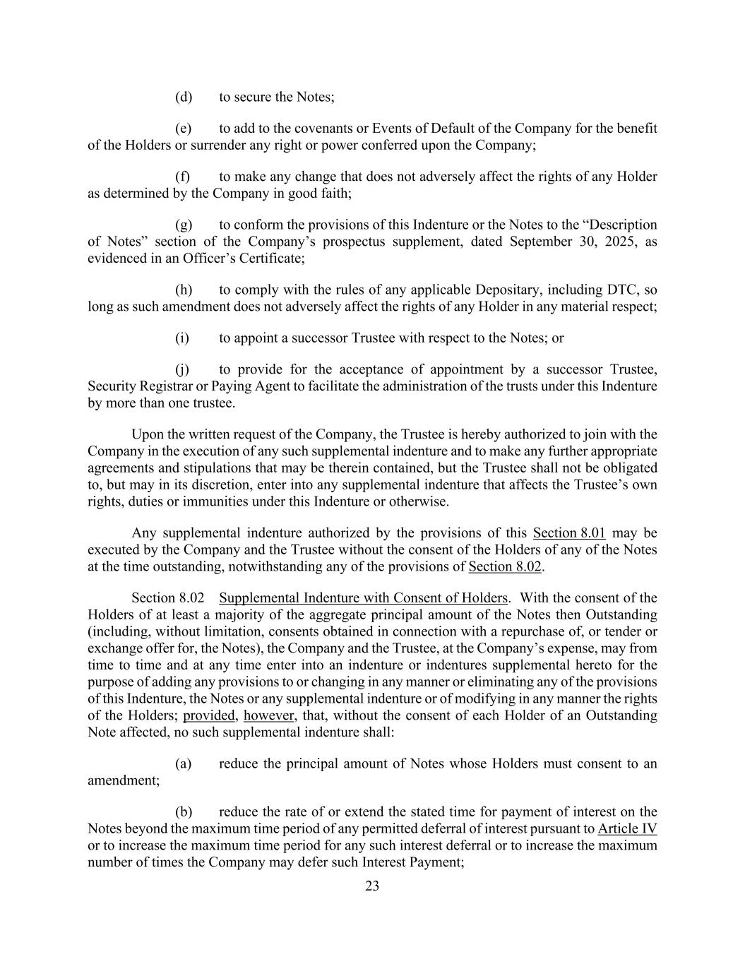 23 (d) to secure the Notes; (e) to add to the covenants or Events of Default of the Company for the benefit of the Holders or surrender any right or power conferred upon the Company; (f) to make any change that does not adversely affect the rights of any Holder as determined by the Company in good faith; (g) to conform the provisions of this Indenture or the Notes to the “Description of Notes” section of the Company’s prospectus supplement, dated September 30, 2025, as evidenced in an Officer’s Certificate; (h) to comply with the rules of any applicable Depositary, including DTC, so long as such amendment does not adversely affect the rights of any Holder in any material respect; (i) to appoint a successor Trustee with respect to the Notes; or (j) to provide for the acceptance of appointment by a successor Trustee, Security Registrar or Paying Agent to facilitate the administration of the trusts under this Indenture by more than one trustee. Upon the written request of the Company, the Trustee is hereby authorized to join with the Company in the execution of any such supplemental indenture and to make any further appropriate agreements and stipulations that may be therein contained, but the Trustee shall not be obligated to, but may in its discretion, enter into any supplemental indenture that affects the Trustee’s own rights, duties or immunities under this Indenture or otherwise. Any supplemental indenture authorized by the provisions of this Section 8.01 may be executed by the Company and the Trustee without the consent of the Holders of any of the Notes at the time outstanding, notwithstanding any of the provisions of Section 8.02. Section 8.02 Supplemental Indenture with Consent of Holders. With the consent of the Holders of at least a majority of the aggregate principal amount of the Notes then Outstanding (including, without limitation, consents obtained in connection with a repurchase of, or tender or exchange offer for, the Notes), the Company and the Trustee, at the Company’s expense, may from time to time and at any time enter into an indenture or indentures supplemental hereto for the purpose of adding any provisions to or changing in any manner or eliminating any of the provisions of this Indenture, the Notes or any supplemental indenture or of modifying in any manner the rights of the Holders; provided, however, that, without the consent of each Holder of an Outstanding Note affected, no such supplemental indenture shall: (a) reduce the principal amount of Notes whose Holders must consent to an amendment; (b) reduce the rate of or extend the stated time for payment of interest on the Notes beyond the maximum time period of any permitted deferral of interest pursuant to Article IV or to increase the maximum time period for any such interest deferral or to increase the maximum number of times the Company may defer such Interest Payment;