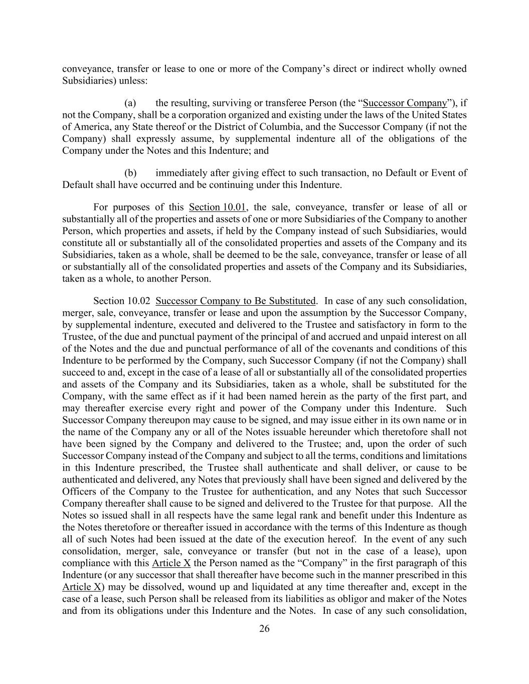 26 conveyance, transfer or lease to one or more of the Company’s direct or indirect wholly owned Subsidiaries) unless: (a) the resulting, surviving or transferee Person (the “Successor Company”), if not the Company, shall be a corporation organized and existing under the laws of the United States of America, any State thereof or the District of Columbia, and the Successor Company (if not the Company) shall expressly assume, by supplemental indenture all of the obligations of the Company under the Notes and this Indenture; and (b) immediately after giving effect to such transaction, no Default or Event of Default shall have occurred and be continuing under this Indenture. For purposes of this Section 10.01, the sale, conveyance, transfer or lease of all or substantially all of the properties and assets of one or more Subsidiaries of the Company to another Person, which properties and assets, if held by the Company instead of such Subsidiaries, would constitute all or substantially all of the consolidated properties and assets of the Company and its Subsidiaries, taken as a whole, shall be deemed to be the sale, conveyance, transfer or lease of all or substantially all of the consolidated properties and assets of the Company and its Subsidiaries, taken as a whole, to another Person. Section 10.02 Successor Company to Be Substituted. In case of any such consolidation, merger, sale, conveyance, transfer or lease and upon the assumption by the Successor Company, by supplemental indenture, executed and delivered to the Trustee and satisfactory in form to the Trustee, of the due and punctual payment of the principal of and accrued and unpaid interest on all of the Notes and the due and punctual performance of all of the covenants and conditions of this Indenture to be performed by the Company, such Successor Company (if not the Company) shall succeed to and, except in the case of a lease of all or substantially all of the consolidated properties and assets of the Company and its Subsidiaries, taken as a whole, shall be substituted for the Company, with the same effect as if it had been named herein as the party of the first part, and may thereafter exercise every right and power of the Company under this Indenture. Such Successor Company thereupon may cause to be signed, and may issue either in its own name or in the name of the Company any or all of the Notes issuable hereunder which theretofore shall not have been signed by the Company and delivered to the Trustee; and, upon the order of such Successor Company instead of the Company and subject to all the terms, conditions and limitations in this Indenture prescribed, the Trustee shall authenticate and shall deliver, or cause to be authenticated and delivered, any Notes that previously shall have been signed and delivered by the Officers of the Company to the Trustee for authentication, and any Notes that such Successor Company thereafter shall cause to be signed and delivered to the Trustee for that purpose. All the Notes so issued shall in all respects have the same legal rank and benefit under this Indenture as the Notes theretofore or thereafter issued in accordance with the terms of this Indenture as though all of such Notes had been issued at the date of the execution hereof. In the event of any such consolidation, merger, sale, conveyance or transfer (but not in the case of a lease), upon compliance with this Article X the Person named as the “Company” in the first paragraph of this Indenture (or any successor that shall thereafter have become such in the manner prescribed in this Article X) may be dissolved, wound up and liquidated at any time thereafter and, except in the case of a lease, such Person shall be released from its liabilities as obligor and maker of the Notes and from its obligations under this Indenture and the Notes. In case of any such consolidation,