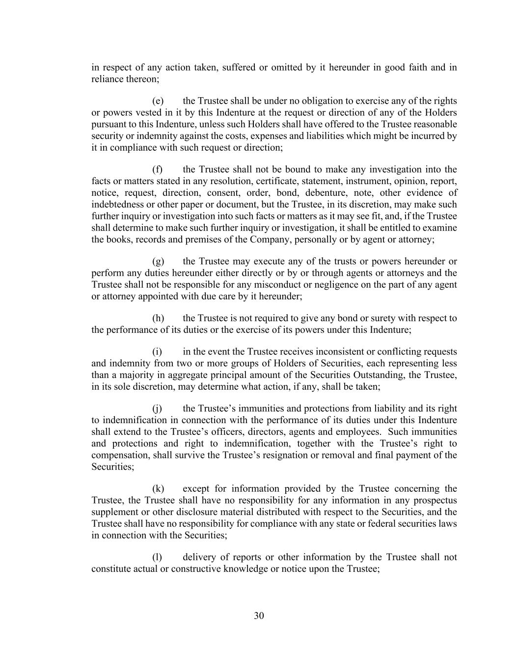 30 in respect of any action taken, suffered or omitted by it hereunder in good faith and in reliance thereon; (e) the Trustee shall be under no obligation to exercise any of the rights or powers vested in it by this Indenture at the request or direction of any of the Holders pursuant to this Indenture, unless such Holders shall have offered to the Trustee reasonable security or indemnity against the costs, expenses and liabilities which might be incurred by it in compliance with such request or direction; (f) the Trustee shall not be bound to make any investigation into the facts or matters stated in any resolution, certificate, statement, instrument, opinion, report, notice, request, direction, consent, order, bond, debenture, note, other evidence of indebtedness or other paper or document, but the Trustee, in its discretion, may make such further inquiry or investigation into such facts or matters as it may see fit, and, if the Trustee shall determine to make such further inquiry or investigation, it shall be entitled to examine the books, records and premises of the Company, personally or by agent or attorney; (g) the Trustee may execute any of the trusts or powers hereunder or perform any duties hereunder either directly or by or through agents or attorneys and the Trustee shall not be responsible for any misconduct or negligence on the part of any agent or attorney appointed with due care by it hereunder; (h) the Trustee is not required to give any bond or surety with respect to the performance of its duties or the exercise of its powers under this Indenture; (i) in the event the Trustee receives inconsistent or conflicting requests and indemnity from two or more groups of Holders of Securities, each representing less than a majority in aggregate principal amount of the Securities Outstanding, the Trustee, in its sole discretion, may determine what action, if any, shall be taken; (j) the Trustee’s immunities and protections from liability and its right to indemnification in connection with the performance of its duties under this Indenture shall extend to the Trustee’s officers, directors, agents and employees. Such immunities and protections and right to indemnification, together with the Trustee’s right to compensation, shall survive the Trustee’s resignation or removal and final payment of the Securities; (k) except for information provided by the Trustee concerning the Trustee, the Trustee shall have no responsibility for any information in any prospectus supplement or other disclosure material distributed with respect to the Securities, and the Trustee shall have no responsibility for compliance with any state or federal securities laws in connection with the Securities; (l) delivery of reports or other information by the Trustee shall not constitute actual or constructive knowledge or notice upon the Trustee;