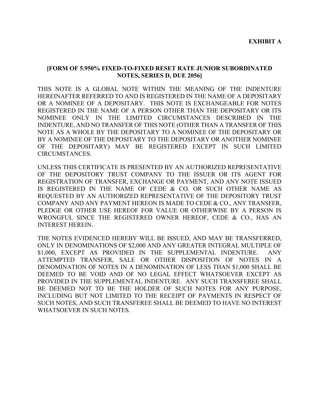 EXHIBIT A [FORM OF 5.950% FIXED-TO-FIXED RESET RATE JUNIOR SUBORDINATED NOTES, SERIES D, DUE 2056] THIS NOTE IS A GLOBAL NOTE WITHIN THE MEANING OF THE INDENTURE HEREINAFTER REFERRED TO AND IS REGISTERED IN THE NAME OF A DEPOSITARY OR A NOMINEE OF A DEPOSITARY. THIS NOTE IS EXCHANGEABLE FOR NOTES REGISTERED IN THE NAME OF A PERSON OTHER THAN THE DEPOSITARY OR ITS NOMINEE ONLY IN THE LIMITED CIRCUMSTANCES DESCRIBED IN THE INDENTURE, AND NO TRANSFER OF THIS NOTE (OTHER THAN A TRANSFER OF THIS NOTE AS A WHOLE BY THE DEPOSITARY TO A NOMINEE OF THE DEPOSITARY OR BY A NOMINEE OF THE DEPOSITARY TO THE DEPOSITARY OR ANOTHER NOMINEE OF THE DEPOSITARY) MAY BE REGISTERED EXCEPT IN SUCH LIMITED CIRCUMSTANCES. UNLESS THIS CERTIFICATE IS PRESENTED BY AN AUTHORIZED REPRESENTATIVE OF THE DEPOSITORY TRUST COMPANY TO THE ISSUER OR ITS AGENT FOR REGISTRATION OF TRANSFER, EXCHANGE OR PAYMENT, AND ANY NOTE ISSUED IS REGISTERED IN THE NAME OF CEDE & CO. OR SUCH OTHER NAME AS REQUESTED BY AN AUTHORIZED REPRESENTATIVE OF THE DEPOSITORY TRUST COMPANY AND ANY PAYMENT HEREON IS MADE TO CEDE & CO., ANY TRANSFER, PLEDGE OR OTHER USE HEREOF FOR VALUE OR OTHERWISE BY A PERSON IS WRONGFUL SINCE THE REGISTERED OWNER HEREOF, CEDE & CO., HAS AN INTEREST HEREIN. THE NOTES EVIDENCED HEREBY WILL BE ISSUED, AND MAY BE TRANSFERRED, ONLY IN DENOMINATIONS OF $2,000 AND ANY GREATER INTEGRAL MULTIPLE OF $1,000, EXCEPT AS PROVIDED IN THE SUPPLEMENTAL INDENTURE. ANY ATTEMPTED TRANSFER, SALE OR OTHER DISPOSITION OF NOTES IN A DENOMINATION OF NOTES IN A DENOMINATION OF LESS THAN $1,000 SHALL BE DEEMED TO BE VOID AND OF NO LEGAL EFFECT WHATSOEVER EXCEPT AS PROVIDED IN THE SUPPLEMENTAL INDENTURE. ANY SUCH TRANSFEREE SHALL BE DEEMED NOT TO BE THE HOLDER OF SUCH NOTES FOR ANY PURPOSE, INCLUDING BUT NOT LIMITED TO THE RECEIPT OF PAYMENTS IN RESPECT OF SUCH NOTES, AND SUCH TRANSFEREE SHALL BE DEEMED TO HAVE NO INTEREST WHATSOEVER IN SUCH NOTES.