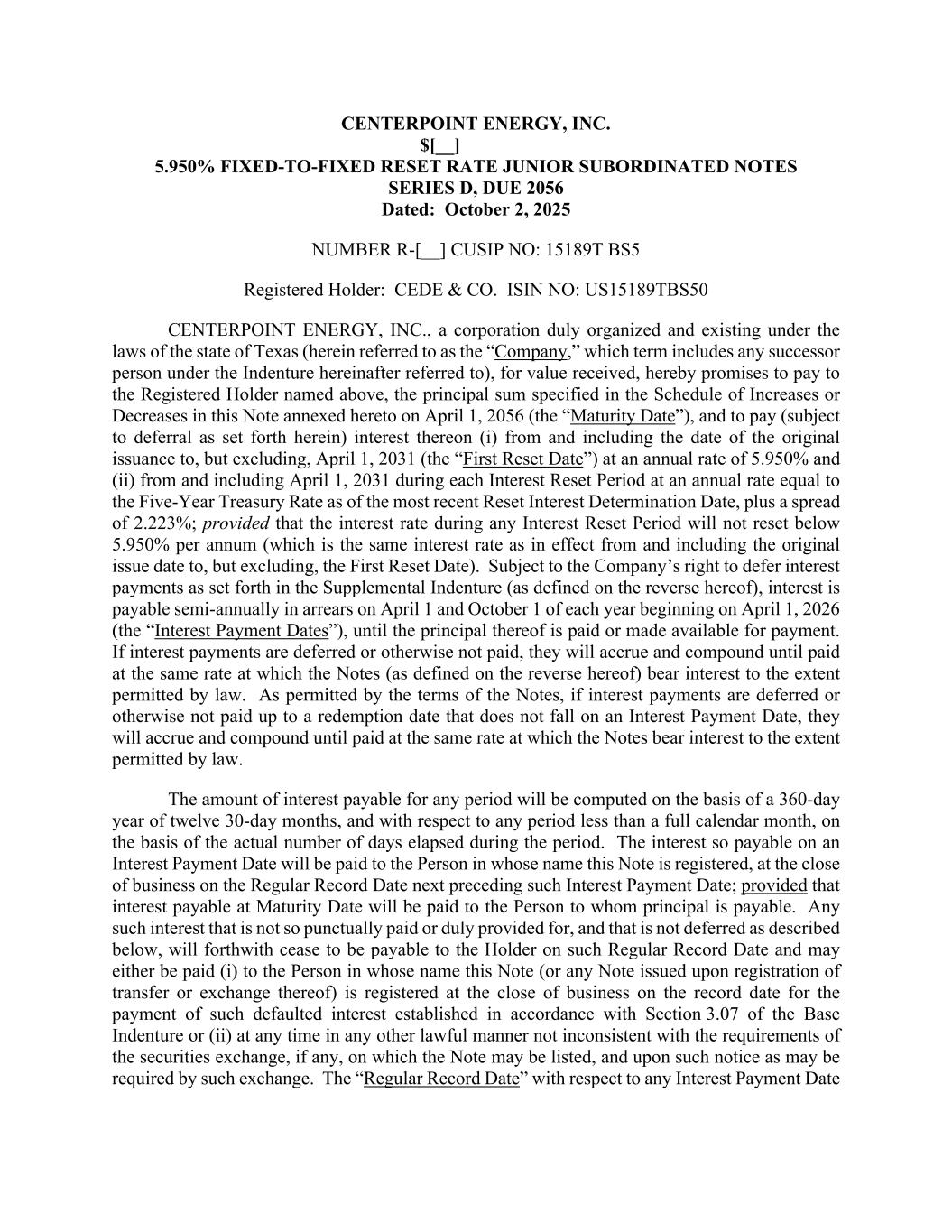 CENTERPOINT ENERGY, INC. $[__] 5.950% FIXED-TO-FIXED RESET RATE JUNIOR SUBORDINATED NOTES SERIES D, DUE 2056 Dated: October 2, 2025 NUMBER R-[__] CUSIP NO: 15189T BS5 Registered Holder: CEDE & CO. ISIN NO: US15189TBS50 CENTERPOINT ENERGY, INC., a corporation duly organized and existing under the laws of the state of Texas (herein referred to as the “Company,” which term includes any successor person under the Indenture hereinafter referred to), for value received, hereby promises to pay to the Registered Holder named above, the principal sum specified in the Schedule of Increases or Decreases in this Note annexed hereto on April 1, 2056 (the “Maturity Date”), and to pay (subject to deferral as set forth herein) interest thereon (i) from and including the date of the original issuance to, but excluding, April 1, 2031 (the “First Reset Date”) at an annual rate of 5.950% and (ii) from and including April 1, 2031 during each Interest Reset Period at an annual rate equal to the Five-Year Treasury Rate as of the most recent Reset Interest Determination Date, plus a spread of 2.223%; provided that the interest rate during any Interest Reset Period will not reset below 5.950% per annum (which is the same interest rate as in effect from and including the original issue date to, but excluding, the First Reset Date). Subject to the Company’s right to defer interest payments as set forth in the Supplemental Indenture (as defined on the reverse hereof), interest is payable semi-annually in arrears on April 1 and October 1 of each year beginning on April 1, 2026 (the “Interest Payment Dates”), until the principal thereof is paid or made available for payment. If interest payments are deferred or otherwise not paid, they will accrue and compound until paid at the same rate at which the Notes (as defined on the reverse hereof) bear interest to the extent permitted by law. As permitted by the terms of the Notes, if interest payments are deferred or otherwise not paid up to a redemption date that does not fall on an Interest Payment Date, they will accrue and compound until paid at the same rate at which the Notes bear interest to the extent permitted by law. The amount of interest payable for any period will be computed on the basis of a 360-day year of twelve 30-day months, and with respect to any period less than a full calendar month, on the basis of the actual number of days elapsed during the period. The interest so payable on an Interest Payment Date will be paid to the Person in whose name this Note is registered, at the close of business on the Regular Record Date next preceding such Interest Payment Date; provided that interest payable at Maturity Date will be paid to the Person to whom principal is payable. Any such interest that is not so punctually paid or duly provided for, and that is not deferred as described below, will forthwith cease to be payable to the Holder on such Regular Record Date and may either be paid (i) to the Person in whose name this Note (or any Note issued upon registration of transfer or exchange thereof) is registered at the close of business on the record date for the payment of such defaulted interest established in accordance with Section 3.07 of the Base Indenture or (ii) at any time in any other lawful manner not inconsistent with the requirements of the securities exchange, if any, on which the Note may be listed, and upon such notice as may be required by such exchange. The “Regular Record Date” with respect to any Interest Payment Date
