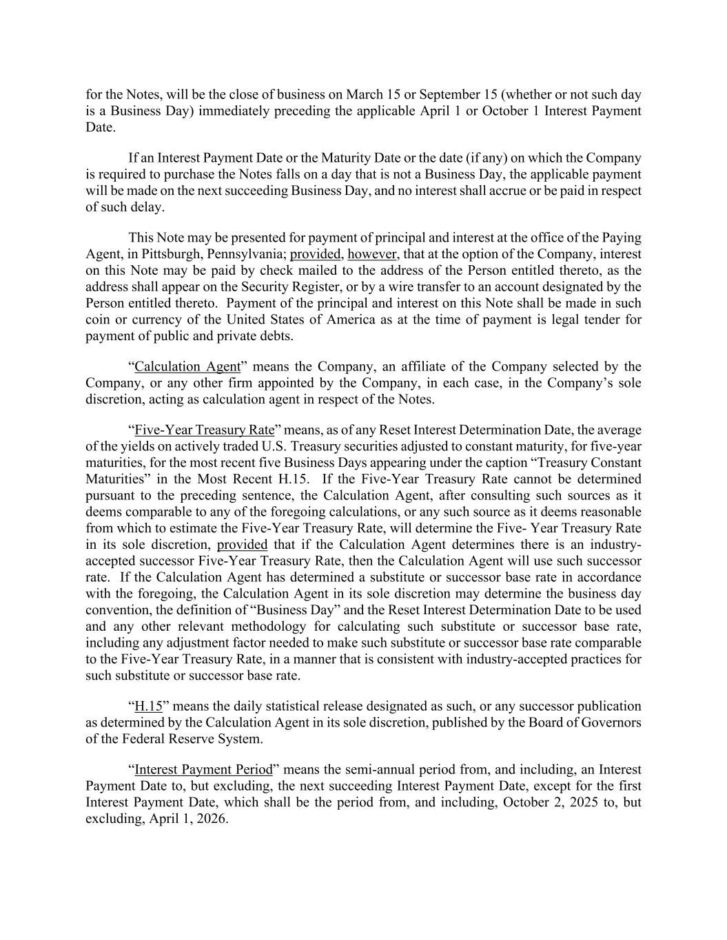 for the Notes, will be the close of business on March 15 or September 15 (whether or not such day is a Business Day) immediately preceding the applicable April 1 or October 1 Interest Payment Date. If an Interest Payment Date or the Maturity Date or the date (if any) on which the Company is required to purchase the Notes falls on a day that is not a Business Day, the applicable payment will be made on the next succeeding Business Day, and no interest shall accrue or be paid in respect of such delay. This Note may be presented for payment of principal and interest at the office of the Paying Agent, in Pittsburgh, Pennsylvania; provided, however, that at the option of the Company, interest on this Note may be paid by check mailed to the address of the Person entitled thereto, as the address shall appear on the Security Register, or by a wire transfer to an account designated by the Person entitled thereto. Payment of the principal and interest on this Note shall be made in such coin or currency of the United States of America as at the time of payment is legal tender for payment of public and private debts. “Calculation Agent” means the Company, an affiliate of the Company selected by the Company, or any other firm appointed by the Company, in each case, in the Company’s sole discretion, acting as calculation agent in respect of the Notes. “Five-Year Treasury Rate” means, as of any Reset Interest Determination Date, the average of the yields on actively traded U.S. Treasury securities adjusted to constant maturity, for five-year maturities, for the most recent five Business Days appearing under the caption “Treasury Constant Maturities” in the Most Recent H.15. If the Five-Year Treasury Rate cannot be determined pursuant to the preceding sentence, the Calculation Agent, after consulting such sources as it deems comparable to any of the foregoing calculations, or any such source as it deems reasonable from which to estimate the Five-Year Treasury Rate, will determine the Five- Year Treasury Rate in its sole discretion, provided that if the Calculation Agent determines there is an industry- accepted successor Five-Year Treasury Rate, then the Calculation Agent will use such successor rate. If the Calculation Agent has determined a substitute or successor base rate in accordance with the foregoing, the Calculation Agent in its sole discretion may determine the business day convention, the definition of “Business Day” and the Reset Interest Determination Date to be used and any other relevant methodology for calculating such substitute or successor base rate, including any adjustment factor needed to make such substitute or successor base rate comparable to the Five-Year Treasury Rate, in a manner that is consistent with industry-accepted practices for such substitute or successor base rate. “H.15” means the daily statistical release designated as such, or any successor publication as determined by the Calculation Agent in its sole discretion, published by the Board of Governors of the Federal Reserve System. “Interest Payment Period” means the semi-annual period from, and including, an Interest Payment Date to, but excluding, the next succeeding Interest Payment Date, except for the first Interest Payment Date, which shall be the period from, and including, October 2, 2025 to, but excluding, April 1, 2026.