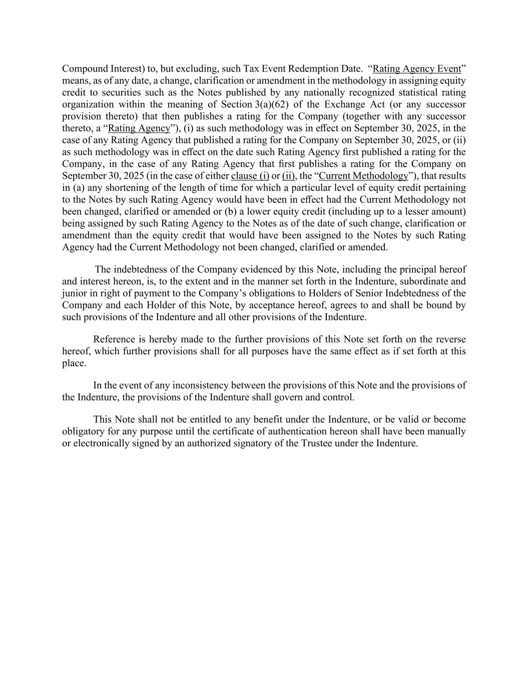 Compound Interest) to, but excluding, such Tax Event Redemption Date. “Rating Agency Event” means, as of any date, a change, clarification or amendment in the methodology in assigning equity credit to securities such as the Notes published by any nationally recognized statistical rating organization within the meaning of Section 3(a)(62) of the Exchange Act (or any successor provision thereto) that then publishes a rating for the Company (together with any successor thereto, a “Rating Agency”), (i) as such methodology was in effect on September 30, 2025, in the case of any Rating Agency that published a rating for the Company on September 30, 2025, or (ii) as such methodology was in effect on the date such Rating Agency first published a rating for the Company, in the case of any Rating Agency that first publishes a rating for the Company on September 30, 2025 (in the case of either clause (i) or (ii), the “Current Methodology”), that results in (a) any shortening of the length of time for which a particular level of equity credit pertaining to the Notes by such Rating Agency would have been in effect had the Current Methodology not been changed, clarified or amended or (b) a lower equity credit (including up to a lesser amount) being assigned by such Rating Agency to the Notes as of the date of such change, clarification or amendment than the equity credit that would have been assigned to the Notes by such Rating Agency had the Current Methodology not been changed, clarified or amended. The indebtedness of the Company evidenced by this Note, including the principal hereof and interest hereon, is, to the extent and in the manner set forth in the Indenture, subordinate and junior in right of payment to the Company’s obligations to Holders of Senior Indebtedness of the Company and each Holder of this Note, by acceptance hereof, agrees to and shall be bound by such provisions of the Indenture and all other provisions of the Indenture. Reference is hereby made to the further provisions of this Note set forth on the reverse hereof, which further provisions shall for all purposes have the same effect as if set forth at this place. In the event of any inconsistency between the provisions of this Note and the provisions of the Indenture, the provisions of the Indenture shall govern and control. This Note shall not be entitled to any benefit under the Indenture, or be valid or become obligatory for any purpose until the certificate of authentication hereon shall have been manually or electronically signed by an authorized signatory of the Trustee under the Indenture.