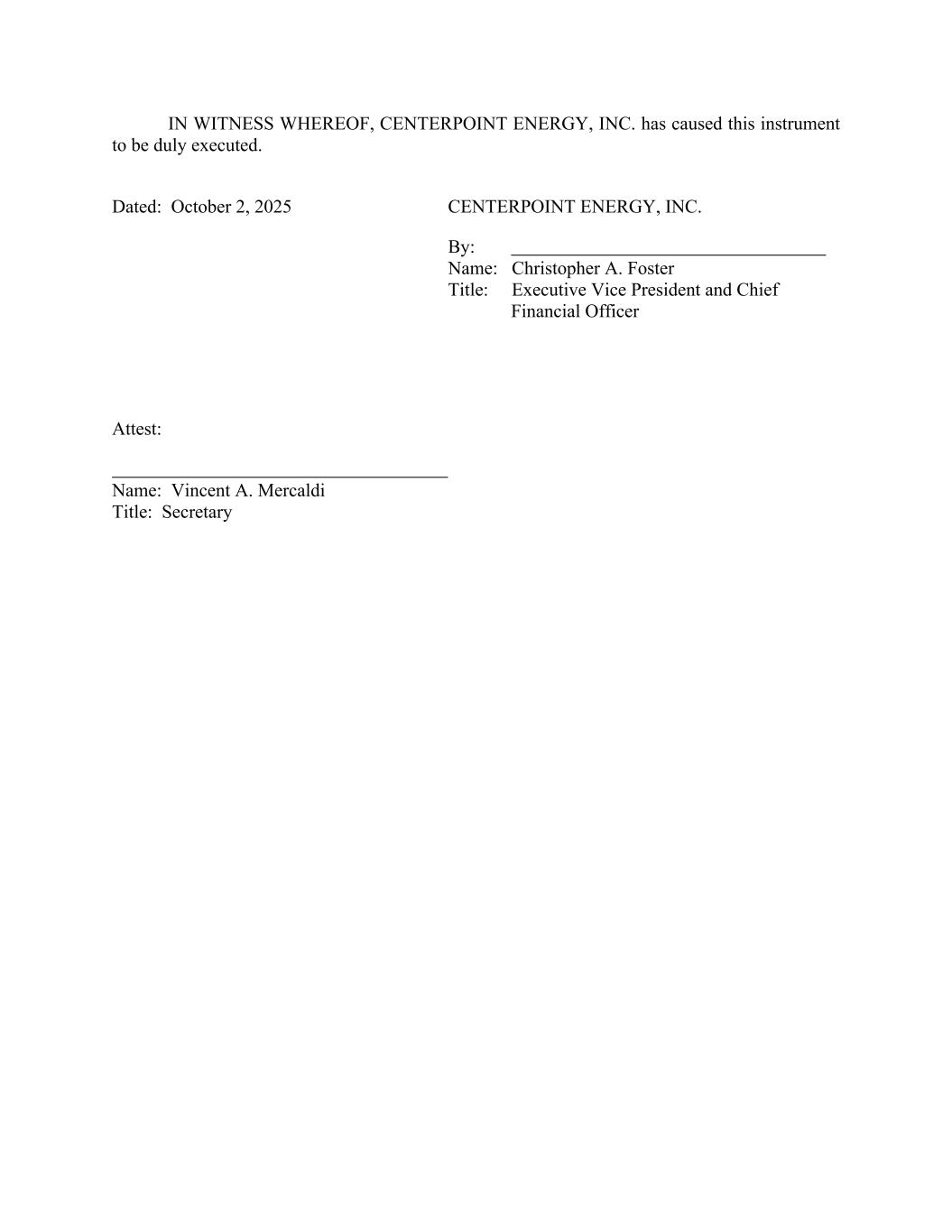 IN WITNESS WHEREOF, CENTERPOINT ENERGY, INC. has caused this instrument to be duly executed. Dated: October 2, 2025 CENTERPOINT ENERGY, INC. By: Name: Christopher A. Foster Title: Executive Vice President and Chief Financial Officer Attest: Name: Vincent A. Mercaldi Title: Secretary