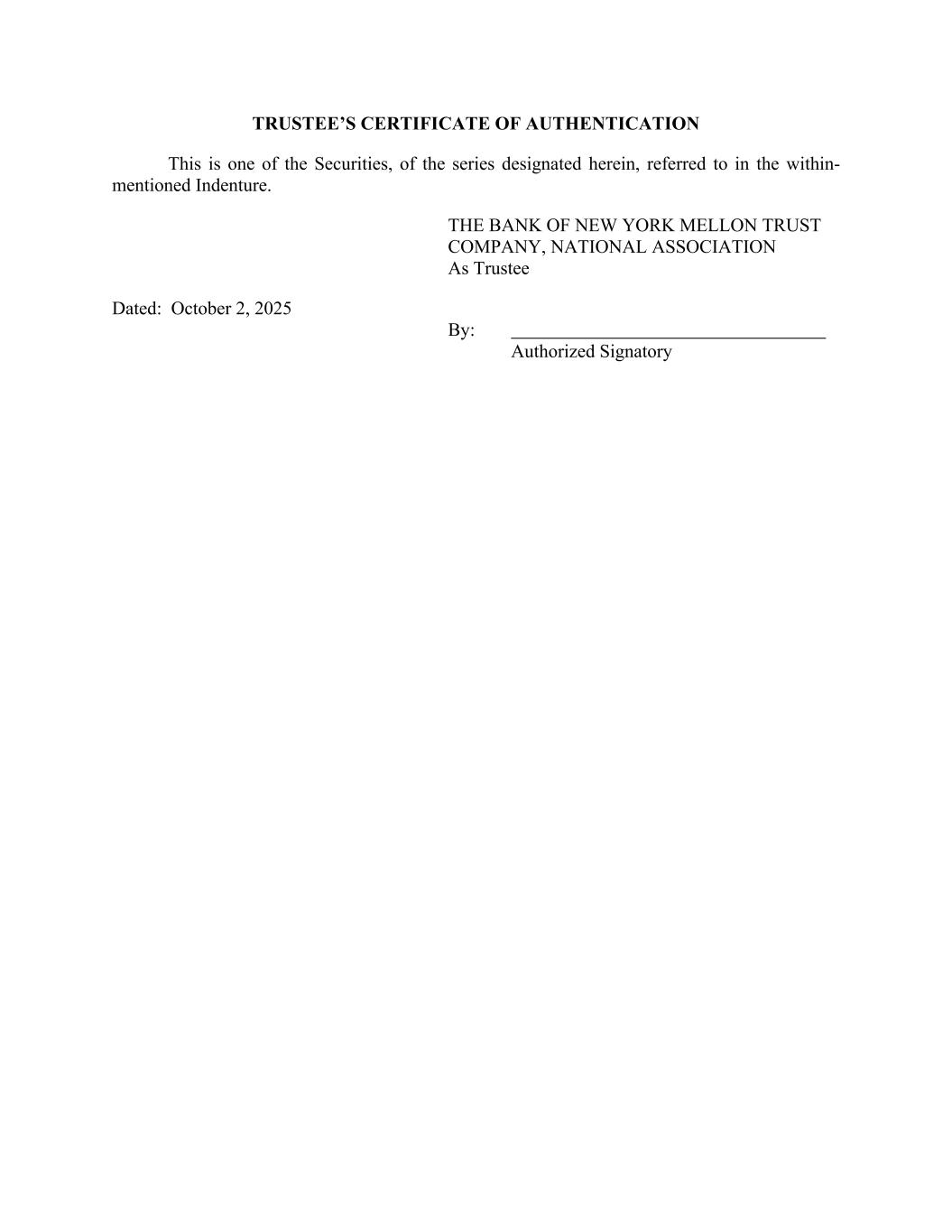 TRUSTEE’S CERTIFICATE OF AUTHENTICATION This is one of the Securities, of the series designated herein, referred to in the within- mentioned Indenture. THE BANK OF NEW YORK MELLON TRUST COMPANY, NATIONAL ASSOCIATION As Trustee Dated: October 2, 2025 By: Authorized Signatory
