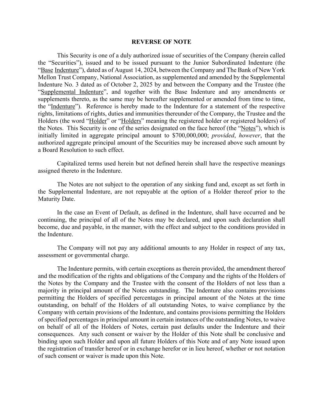 REVERSE OF NOTE This Security is one of a duly authorized issue of securities of the Company (herein called the “Securities”), issued and to be issued pursuant to the Junior Subordinated Indenture (the “Base Indenture”), dated as of August 14, 2024, between the Company and The Bank of New York Mellon Trust Company, National Association, as supplemented and amended by the Supplemental Indenture No. 3 dated as of October 2, 2025 by and between the Company and the Trustee (the “Supplemental Indenture”, and together with the Base Indenture and any amendments or supplements thereto, as the same may be hereafter supplemented or amended from time to time, the “Indenture”). Reference is hereby made to the Indenture for a statement of the respective rights, limitations of rights, duties and immunities thereunder of the Company, the Trustee and the Holders (the word “Holder” or “Holders” meaning the registered holder or registered holders) of the Notes. This Security is one of the series designated on the face hereof (the “Notes”), which is initially limited in aggregate principal amount to $700,000,000; provided, however, that the authorized aggregate principal amount of the Securities may be increased above such amount by a Board Resolution to such effect. Capitalized terms used herein but not defined herein shall have the respective meanings assigned thereto in the Indenture. The Notes are not subject to the operation of any sinking fund and, except as set forth in the Supplemental Indenture, are not repayable at the option of a Holder thereof prior to the Maturity Date. In the case an Event of Default, as defined in the Indenture, shall have occurred and be continuing, the principal of all of the Notes may be declared, and upon such declaration shall become, due and payable, in the manner, with the effect and subject to the conditions provided in the Indenture. The Company will not pay any additional amounts to any Holder in respect of any tax, assessment or governmental charge. The Indenture permits, with certain exceptions as therein provided, the amendment thereof and the modification of the rights and obligations of the Company and the rights of the Holders of the Notes by the Company and the Trustee with the consent of the Holders of not less than a majority in principal amount of the Notes outstanding. The Indenture also contains provisions permitting the Holders of specified percentages in principal amount of the Notes at the time outstanding, on behalf of the Holders of all outstanding Notes, to waive compliance by the Company with certain provisions of the Indenture, and contains provisions permitting the Holders of specified percentages in principal amount in certain instances of the outstanding Notes, to waive on behalf of all of the Holders of Notes, certain past defaults under the Indenture and their consequences. Any such consent or waiver by the Holder of this Note shall be conclusive and binding upon such Holder and upon all future Holders of this Note and of any Note issued upon the registration of transfer hereof or in exchange herefor or in lieu hereof, whether or not notation of such consent or waiver is made upon this Note.
