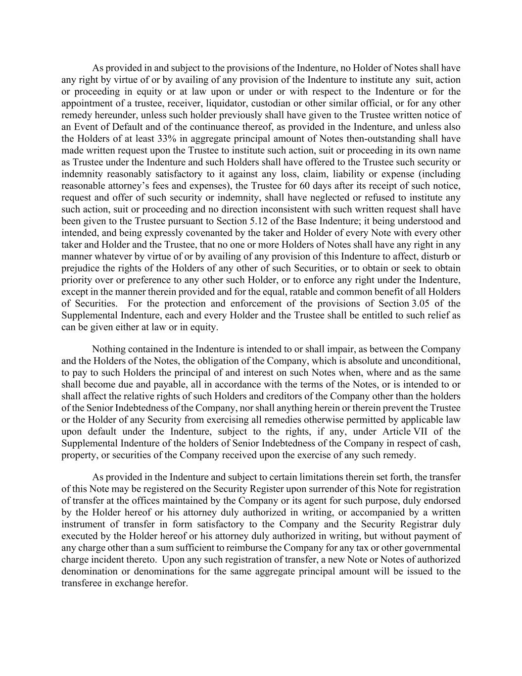 As provided in and subject to the provisions of the Indenture, no Holder of Notes shall have any right by virtue of or by availing of any provision of the Indenture to institute any suit, action or proceeding in equity or at law upon or under or with respect to the Indenture or for the appointment of a trustee, receiver, liquidator, custodian or other similar official, or for any other remedy hereunder, unless such holder previously shall have given to the Trustee written notice of an Event of Default and of the continuance thereof, as provided in the Indenture, and unless also the Holders of at least 33% in aggregate principal amount of Notes then-outstanding shall have made written request upon the Trustee to institute such action, suit or proceeding in its own name as Trustee under the Indenture and such Holders shall have offered to the Trustee such security or indemnity reasonably satisfactory to it against any loss, claim, liability or expense (including reasonable attorney’s fees and expenses), the Trustee for 60 days after its receipt of such notice, request and offer of such security or indemnity, shall have neglected or refused to institute any such action, suit or proceeding and no direction inconsistent with such written request shall have been given to the Trustee pursuant to Section 5.12 of the Base Indenture; it being understood and intended, and being expressly covenanted by the taker and Holder of every Note with every other taker and Holder and the Trustee, that no one or more Holders of Notes shall have any right in any manner whatever by virtue of or by availing of any provision of this Indenture to affect, disturb or prejudice the rights of the Holders of any other of such Securities, or to obtain or seek to obtain priority over or preference to any other such Holder, or to enforce any right under the Indenture, except in the manner therein provided and for the equal, ratable and common benefit of all Holders of Securities. For the protection and enforcement of the provisions of Section 3.05 of the Supplemental Indenture, each and every Holder and the Trustee shall be entitled to such relief as can be given either at law or in equity. Nothing contained in the Indenture is intended to or shall impair, as between the Company and the Holders of the Notes, the obligation of the Company, which is absolute and unconditional, to pay to such Holders the principal of and interest on such Notes when, where and as the same shall become due and payable, all in accordance with the terms of the Notes, or is intended to or shall affect the relative rights of such Holders and creditors of the Company other than the holders of the Senior Indebtedness of the Company, nor shall anything herein or therein prevent the Trustee or the Holder of any Security from exercising all remedies otherwise permitted by applicable law upon default under the Indenture, subject to the rights, if any, under Article VII of the Supplemental Indenture of the holders of Senior Indebtedness of the Company in respect of cash, property, or securities of the Company received upon the exercise of any such remedy. As provided in the Indenture and subject to certain limitations therein set forth, the transfer of this Note may be registered on the Security Register upon surrender of this Note for registration of transfer at the offices maintained by the Company or its agent for such purpose, duly endorsed by the Holder hereof or his attorney duly authorized in writing, or accompanied by a written instrument of transfer in form satisfactory to the Company and the Security Registrar duly executed by the Holder hereof or his attorney duly authorized in writing, but without payment of any charge other than a sum sufficient to reimburse the Company for any tax or other governmental charge incident thereto. Upon any such registration of transfer, a new Note or Notes of authorized denomination or denominations for the same aggregate principal amount will be issued to the transferee in exchange herefor.