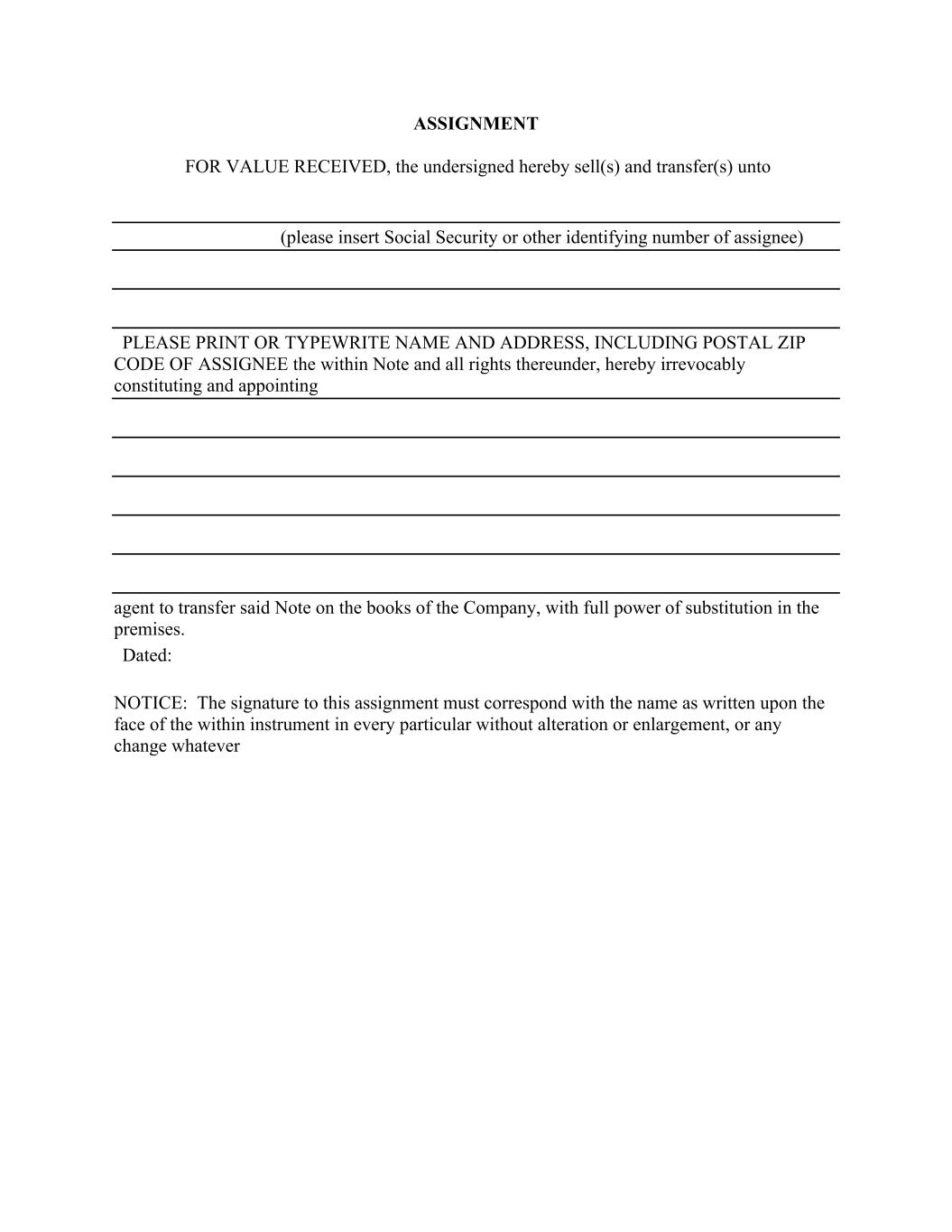 ASSIGNMENT FOR VALUE RECEIVED, the undersigned hereby sell(s) and transfer(s) unto (please insert Social Security or other identifying number of assignee) PLEASE PRINT OR TYPEWRITE NAME AND ADDRESS, INCLUDING POSTAL ZIP CODE OF ASSIGNEE the within Note and all rights thereunder, hereby irrevocably constituting and appointing agent to transfer said Note on the books of the Company, with full power of substitution in the premises. Dated: NOTICE: The signature to this assignment must correspond with the name as written upon the face of the within instrument in every particular without alteration or enlargement, or any change whatever