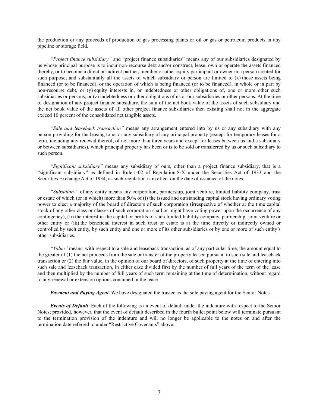 7 the production or any proceeds of production of gas processing plants or oil or gas or petroleum products in any pipeline or storage field. “Project finance subsidiary” and “project finance subsidiaries” means any of our subsidiaries designated by us whose principal purpose is to incur non-recourse debt and/or construct, lease, own or operate the assets financed thereby, or to become a direct or indirect partner, member or other equity participant or owner in a person created for such purpose, and substantially all the assets of which subsidiary or person are limited to (x) those assets being financed (or to be financed), or the operation of which is being financed (or to be financed), in whole or in part by non-recourse debt, or (y) equity interests in, or indebtedness or other obligations of, one or more other such subsidiaries or persons, or (z) indebtedness or other obligations of us or our subsidiaries or other persons. At the time of designation of any project finance subsidiary, the sum of the net book value of the assets of such subsidiary and the net book value of the assets of all other project finance subsidiaries then existing shall not in the aggregate exceed 10 percent of the consolidated net tangible assets. “Sale and leaseback transaction” means any arrangement entered into by us or any subsidiary with any person providing for the leasing to us or any subsidiary of any principal property (except for temporary leases for a term, including any renewal thereof, of not more than three years and except for leases between us and a subsidiary or between subsidiaries), which principal property has been or is to be sold or transferred by us or such subsidiary to such person. “Significant subsidiary” means any subsidiary of ours, other than a project finance subsidiary, that is a “significant subsidiary” as defined in Rule 1-02 of Regulation S-X under the Securities Act of 1933 and the Securities Exchange Act of 1934, as such regulation is in effect on the date of issuance of the notes. “Subsidiary” of any entity means any corporation, partnership, joint venture, limited liability company, trust or estate of which (or in which) more than 50% of (i) the issued and outstanding capital stock having ordinary voting power to elect a majority of the board of directors of such corporation (irrespective of whether at the time capital stock of any other class or classes of such corporation shall or might have voting power upon the occurrence of any contingency), (ii) the interest in the capital or profits of such limited liability company, partnership, joint venture or other entity or (iii) the beneficial interest in such trust or estate is at the time directly or indirectly owned or controlled by such entity, by such entity and one or more of its other subsidiaries or by one or more of such entity’s other subsidiaries. “Value” means, with respect to a sale and leaseback transaction, as of any particular time, the amount equal to the greater of (1) the net proceeds from the sale or transfer of the property leased pursuant to such sale and leaseback transaction or (2) the fair value, in the opinion of our board of directors, of such property at the time of entering into such sale and leaseback transaction, in either case divided first by the number of full years of the term of the lease and then multiplied by the number of full years of such term remaining at the time of determination, without regard to any renewal or extension options contained in the lease. Payment and Paying Agent. We have designated the trustee as the sole paying agent for the Senior Notes. Events of Default. Each of the following is an event of default under the indenture with respect to the Senior Notes; provided, however, that the event of default described in the fourth bullet point below will terminate pursuant to the termination provision of the indenture and will no longer be applicable to the notes on and after the termination date referred to under “Restrictive Covenants” above: