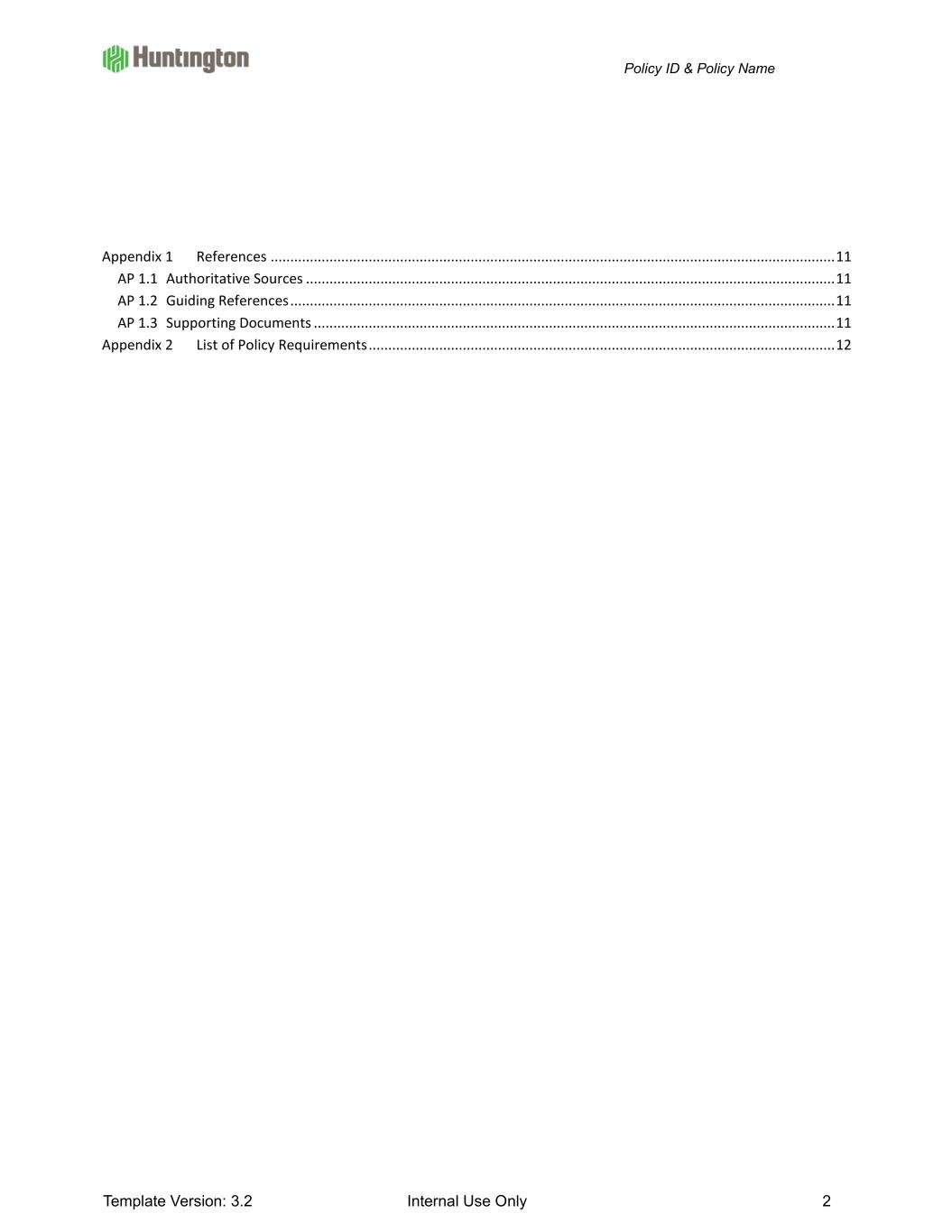 Policy ID & Policy Name Template Version: 3.2 Internal Use Only 2 Appendix 1 References ................................................................................................................................................ 11 AP 1.1 Authoritative Sources ....................................................................................................................................... 11 AP 1.2 Guiding References ........................................................................................................................................... 11 AP 1.3 Supporting Documents ..................................................................................................................................... 11 Appendix 2 List of Policy Requirements ....................................................................................................................... 12
