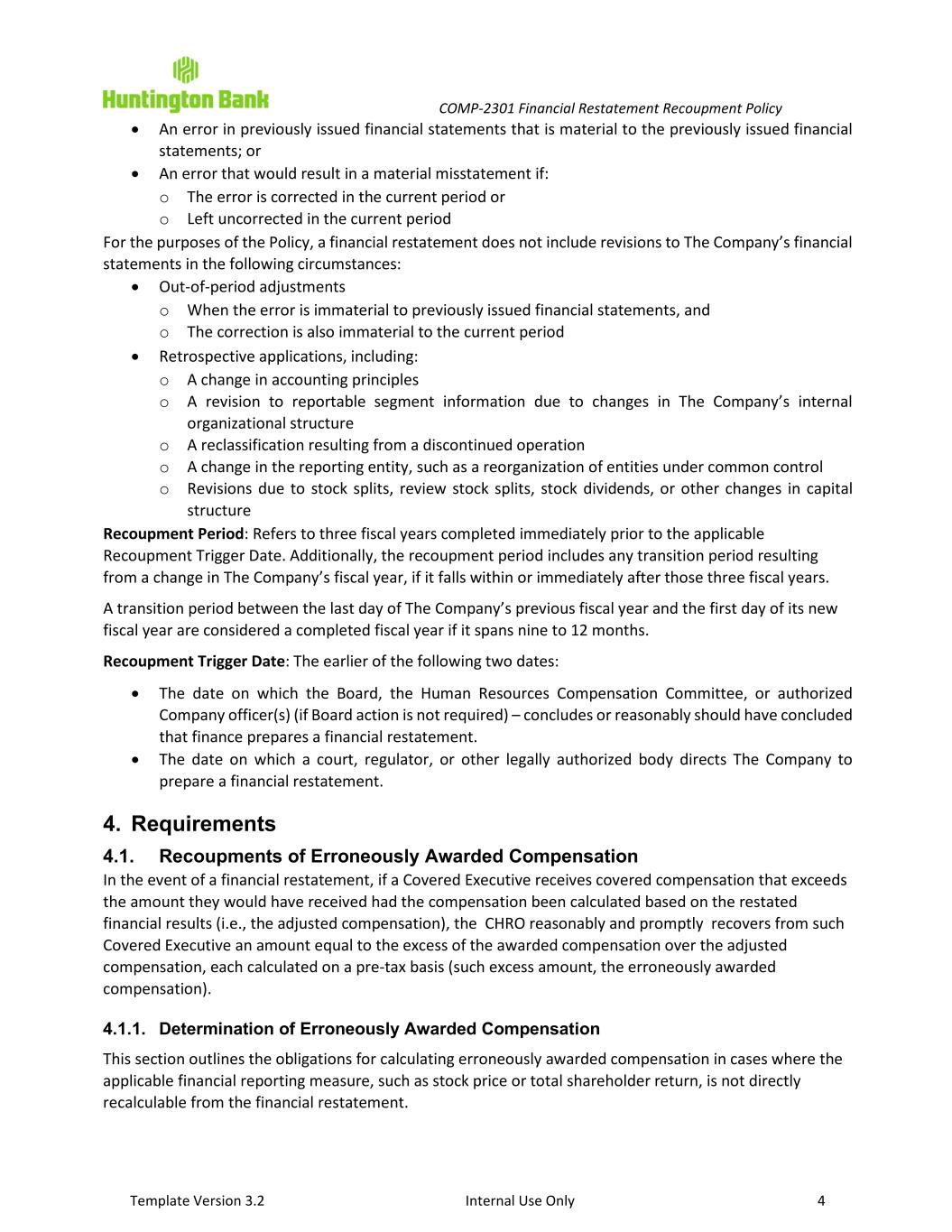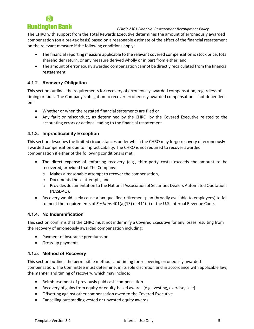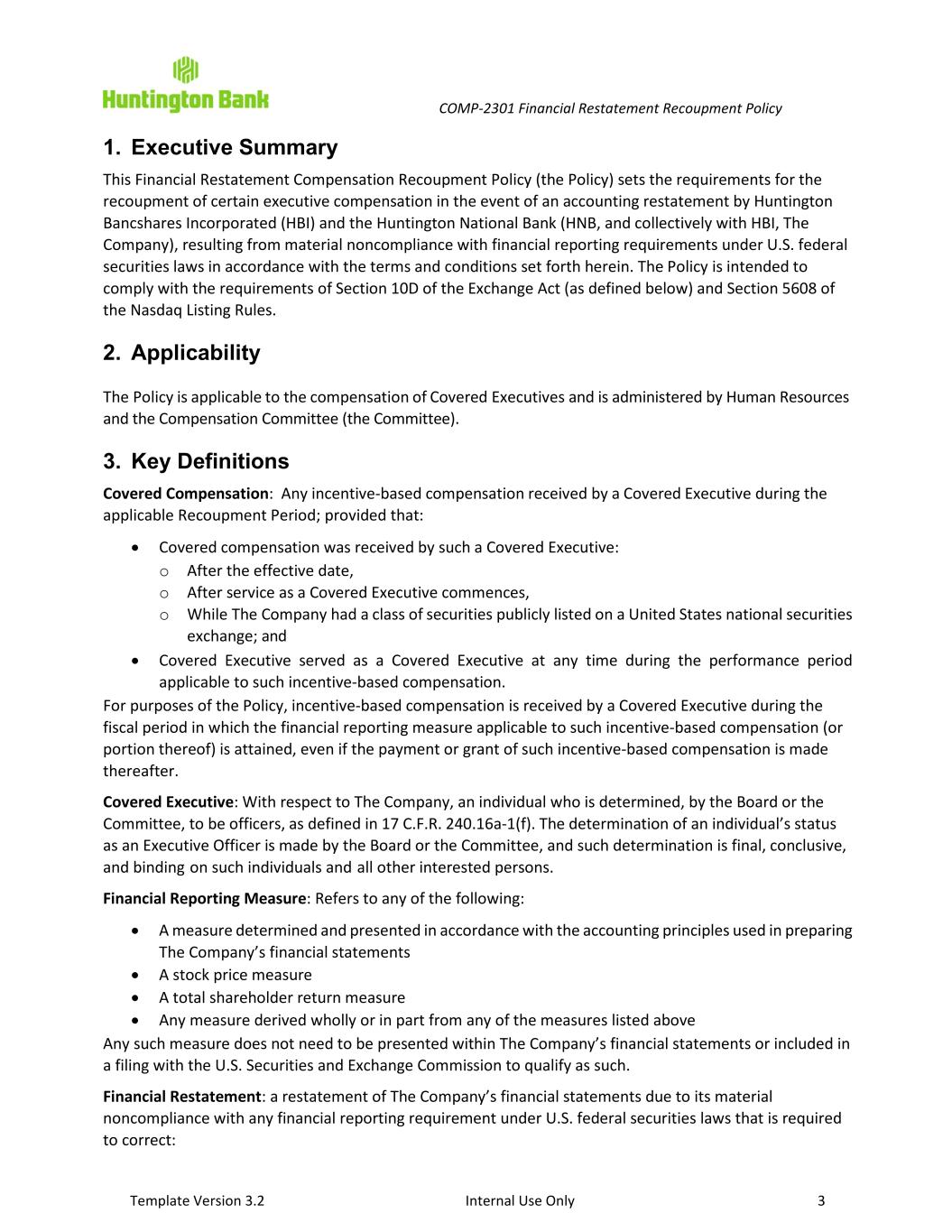 COMP-2301 Financial Restatement Recoupment Policy Template Version 3.2 Internal Use Only 3 1. Executive Summary This Financial Restatement Compensation Recoupment Policy (the Policy) sets the requirements for the recoupment of certain executive compensation in the event of an accounting restatement by Huntington Bancshares Incorporated (HBI) and the Huntington National Bank (HNB, and collectively with HBI, The Company), resulting from material noncompliance with financial reporting requirements under U.S. federal securities laws in accordance with the terms and conditions set forth herein. The Policy is intended to comply with the requirements of Section 10D of the Exchange Act (as defined below) and Section 5608 of the Nasdaq Listing Rules. 2. Applicability The Policy is applicable to the compensation of Covered Executives and is administered by Human Resources and the Compensation Committee (the Committee). 3. Key Definitions Covered Compensation: Any incentive-based compensation received by a Covered Executive during the applicable Recoupment Period; provided that: • Covered compensation was received by such a Covered Executive: o After the effective date, o After service as a Covered Executive commences, o While The Company had a class of securities publicly listed on a United States national securities exchange; and • Covered Executive served as a Covered Executive at any time during the performance period applicable to such incentive-based compensation. For purposes of the Policy, incentive-based compensation is received by a Covered Executive during the fiscal period in which the financial reporting measure applicable to such incentive-based compensation (or portion thereof) is attained, even if the payment or grant of such incentive-based compensation is made thereafter. Covered Executive: With respect to The Company, an individual who is determined, by the Board or the Committee, to be officers, as defined in 17 C.F.R. 240.16a-1(f). The determination of an individual’s status as an Executive Officer is made by the Board or the Committee, and such determination is final, conclusive, and binding on such individuals and all other interested persons. Financial Reporting Measure: Refers to any of the following: • A measure determined and presented in accordance with the accounting principles used in preparing The Company’s financial statements • A stock price measure • A total shareholder return measure • Any measure derived wholly or in part from any of the measures listed above Any such measure does not need to be presented within The Company’s financial statements or included in a filing with the U.S. Securities and Exchange Commission to qualify as such. Financial Restatement: a restatement of The Company’s financial statements due to its material noncompliance with any financial reporting requirement under U.S. federal securities laws that is required to correct: