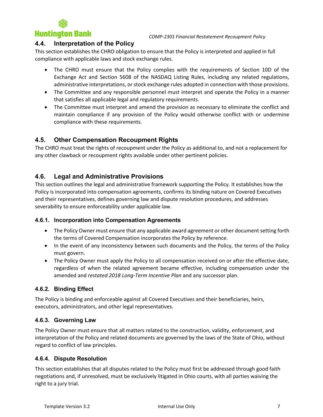 COMP-2301 Financial Restatement Recoupment Policy Template Version 3.2 Internal Use Only 7 4.4. Interpretation of the Policy This section establishes the CHRO obligation to ensure that the Policy is interpreted and applied in full compliance with applicable laws and stock exchange rules. • The CHRO must ensure that the Policy complies with the requirements of Section 10D of the Exchange Act and Section 5608 of the NASDAQ Listing Rules, including any related regulations, administrative interpretations, or stock exchange rules adopted in connection with those provisions. • The Committee and any responsible personnel must interpret and operate the Policy in a manner that satisfies all applicable legal and regulatory requirements. • The Committee must interpret and amend the provision as necessary to eliminate the conflict and maintain compliance if any provision of the Policy would otherwise conflict with or undermine compliance with these requirements. 4.5. Other Compensation Recoupment Rights The CHRO must treat the rights of recoupment under the Policy as additional to, and not a replacement for any other clawback or recoupment rights available under other pertinent policies. 4.6. Legal and Administrative Provisions This section outlines the legal and administrative framework supporting the Policy. It establishes how the Policy is incorporated into compensation agreements, confirms its binding nature on Covered Executives and their representatives, defines governing law and dispute resolution procedures, and addresses severability to ensure enforceability under applicable law. 4.6.1. Incorporation into Compensation Agreements • The Policy Owner must ensure that any applicable award agreement or other document setting forth the terms of Covered Compensation incorporates the Policy by reference. • In the event of any inconsistency between such documents and the Policy, the terms of the Policy must govern. • The Policy Owner must apply the Policy to all compensation received on or after the effective date, regardless of when the related agreement became effective, including compensation under the amended and restated 2018 Long-Term Incentive Plan and any successor plan. 4.6.2. Binding Effect The Policy is binding and enforceable against all Covered Executives and their beneficiaries, heirs, executors, administrators, and other legal representatives. 4.6.3. Governing Law The Policy Owner must ensure that all matters related to the construction, validity, enforcement, and interpretation of the Policy and related documents are governed by the laws of the State of Ohio, without regard to conflict of law principles. 4.6.4. Dispute Resolution This section establishes that all disputes related to the Policy must first be addressed through good faith negotiations and, if unresolved, must be exclusively litigated in Ohio courts, with all parties waiving the right to a jury trial.