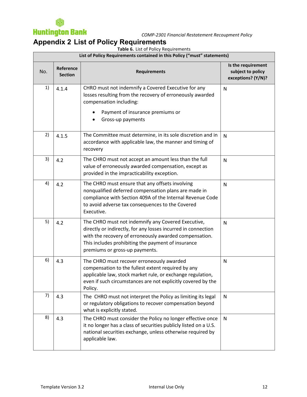 COMP-2301 Financial Restatement Recoupment Policy Template Version 3.2 Internal Use Only 12 Appendix 2 List of Policy Requirements Table 6. List of Policy Requirements List of Policy Requirements contained in this Policy (“must” statements) No. Reference Section Requirements Is the requirement subject to policy exceptions? (Y/N)? 1) 4.1.4 CHRO must not indemnify a Covered Executive for any losses resulting from the recovery of erroneously awarded compensation including: • Payment of insurance premiums or • Gross-up payments N 2) 4.1.5 The Committee must determine, in its sole discretion and in accordance with applicable law, the manner and timing of recovery N 3) 4.2 The CHRO must not accept an amount less than the full value of erroneously awarded compensation, except as provided in the impracticability exception. N 4) 4.2 The CHRO must ensure that any offsets involving nonqualified deferred compensation plans are made in compliance with Section 409A of the Internal Revenue Code to avoid adverse tax consequences to the Covered Executive. N 5) 4.2 The CHRO must not indemnify any Covered Executive, directly or indirectly, for any losses incurred in connection with the recovery of erroneously awarded compensation. This includes prohibiting the payment of insurance premiums or gross-up payments. N 6) 4.3 The CHRO must recover erroneously awarded compensation to the fullest extent required by any applicable law, stock market rule, or exchange regulation, even if such circumstances are not explicitly covered by the Policy. N 7) 4.3 The CHRO must not interpret the Policy as limiting its legal or regulatory obligations to recover compensation beyond what is explicitly stated. N 8) 4.3 The CHRO must consider the Policy no longer effective once it no longer has a class of securities publicly listed on a U.S. national securities exchange, unless otherwise required by applicable law. N