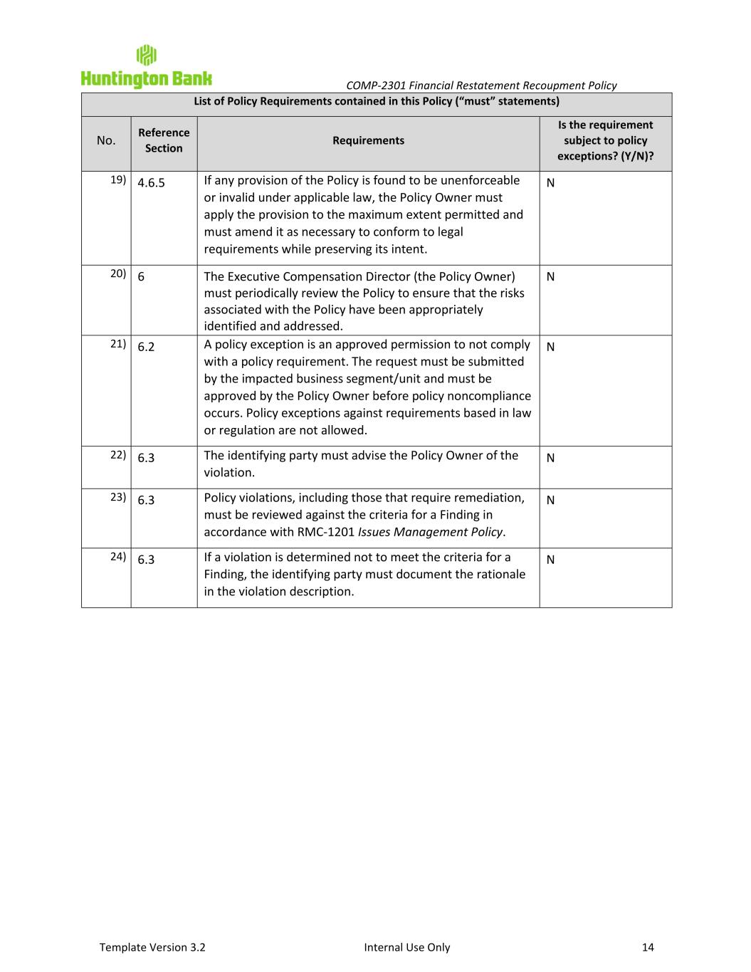 COMP-2301 Financial Restatement Recoupment Policy Template Version 3.2 Internal Use Only 14 List of Policy Requirements contained in this Policy (“must” statements) No. Reference Section Requirements Is the requirement subject to policy exceptions? (Y/N)? 19) 4.6.5 If any provision of the Policy is found to be unenforceable or invalid under applicable law, the Policy Owner must apply the provision to the maximum extent permitted and must amend it as necessary to conform to legal requirements while preserving its intent. N 20) 6 The Executive Compensation Director (the Policy Owner) must periodically review the Policy to ensure that the risks associated with the Policy have been appropriately identified and addressed. N 21) 6.2 A policy exception is an approved permission to not comply with a policy requirement. The request must be submitted by the impacted business segment/unit and must be approved by the Policy Owner before policy noncompliance occurs. Policy exceptions against requirements based in law or regulation are not allowed. N 22) 6.3 The identifying party must advise the Policy Owner of the violation. N 23) 6.3 Policy violations, including those that require remediation, must be reviewed against the criteria for a Finding in accordance with RMC-1201 Issues Management Policy. N 24) 6.3 If a violation is determined not to meet the criteria for a Finding, the identifying party must document the rationale in the violation description. N