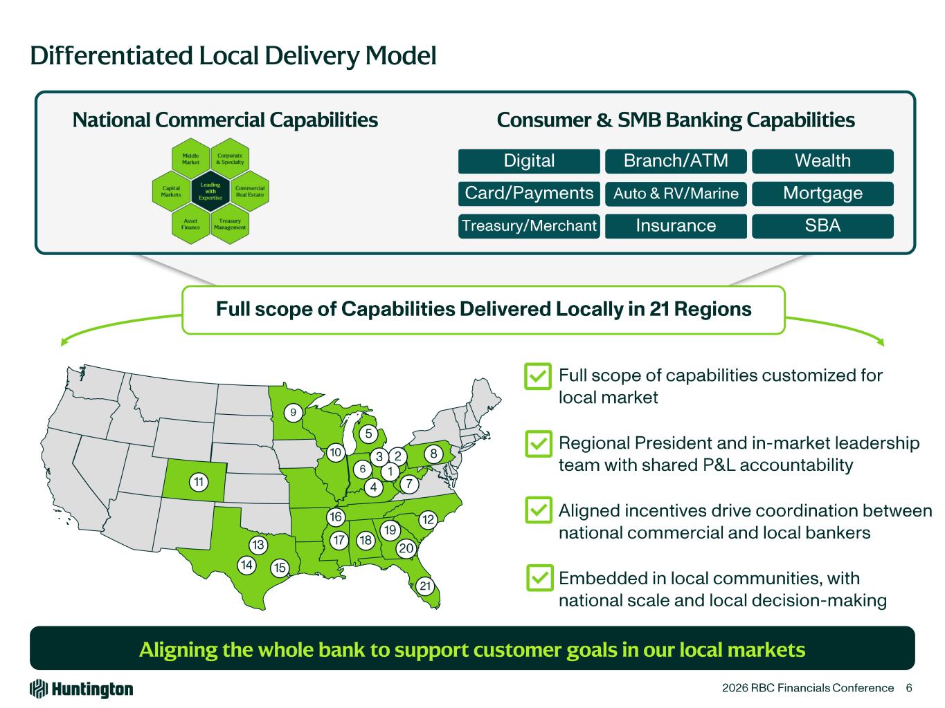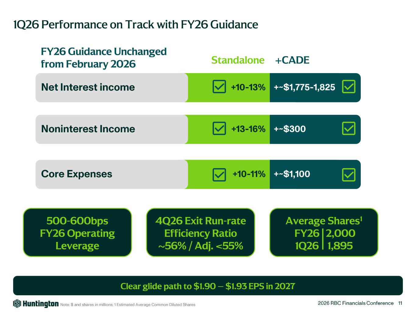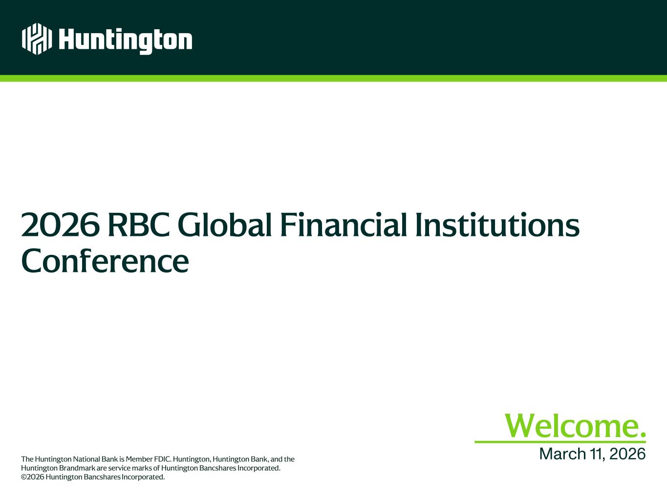 Abundant Green R: 126 G: 207 B: 28 Dark Teal R: 3 G: 79 B: 84 Pastel Teal R: 184 G: 239 B: 228 Pastel Magenta R: 248 G: 224 B: 229 White R: 255 G: 255 B: 255 Prosperous Sage R: 0 G: 45 B: 42 Primary Palette Off-White R: 245 G: 245 B: 245 Highlight Green R: 177 G: 238 B: 44 Legacy Green R: 45 G: 130 B: 42 Light Teal R: 121 G: 222 B: 226 Deep Sage R: 33 G: 72 B: 70 Highlight Teal R: 58 G: 204 B: 223 Charts/Graphs Palette Pastel Magenta R: 248 G: 224 B: 229 Dark Magenta R: 80 G: 16 B: 89 Highlight Magenta R: 193 G: 22 B: 216 Capstone Blue R: 4 G: 30 B: 66 Deep Magenta R: 144 G: 5 B: 163 Second Palette March 11, 2026 2026 RBC Global Financial Institutions Conference Welcome. The Huntington National Bank is Member FDIC. Huntington, Huntington Bank, and the Huntington Brandmark are service marks of Huntington Bancshares Incorporated. ©2026 Huntington Bancshares Incorporated.