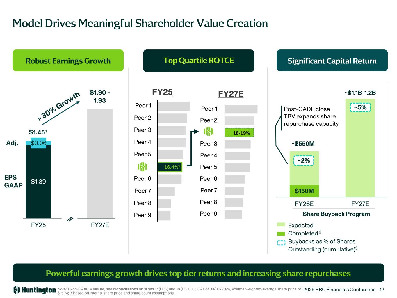 Abundant Green R: 126 G: 207 B: 28 Dark Teal R: 3 G: 79 B: 84 Pastel Teal R: 184 G: 239 B: 228 Pastel Magenta R: 248 G: 224 B: 229 White R: 255 G: 255 B: 255 Prosperous Sage R: 0 G: 45 B: 42 Primary Palette Off-White R: 245 G: 245 B: 245 Highlight Green R: 177 G: 238 B: 44 Legacy Green R: 45 G: 130 B: 42 Light Teal R: 121 G: 222 B: 226 Deep Sage R: 33 G: 72 B: 70 Highlight Teal R: 58 G: 204 B: 223 Charts/Graphs Palette Pastel Magenta R: 248 G: 224 B: 229 Dark Magenta R: 80 G: 16 B: 89 Highlight Magenta R: 193 G: 22 B: 216 Capstone Blue R: 4 G: 30 B: 66 Deep Magenta R: 144 G: 5 B: 163 Second Palette 2026 RBC Financials Conference 18-19% Peer 9 Peer 8 Peer 7 Peer 6 Peer 5 Peer 4 Peer 3 Peer 2 Peer 1 16.4%1 Peer 9 Peer 8 Peer 7 Peer 6 Peer 5 Peer 4 Peer 3 Peer 2 Peer 1 Model Drives Meaningful Shareholder Value Creation Note: 1 Non-GAAP Measure, see reconciliations on slides 17 (EPS) and 18 (ROTCE); 2 As of 03/06/2026, volume weighted -average share price of $16.74; 3 Based on internal share price and share count assumptions. Powerful earnings growth drives top tier returns and increasing share repurchases 12 $1.39 $0.06 FY25 FY27E $1.45 1 Robust Earnings Growth Top Quartile ROTCE Significant Capital Return $150 M ~2% ~5% FY26E FY27E Post -CADE close TBV expands share repurchase capacity • Expected • Completed 2 • Buybacks as % of Shares Outstanding (cumulative) 3 $1.90 - 1.93 Share Buyback Program ~$ 550M ~$1.1B- 1.2BFY27EFY25 EPS GAAP Adj.