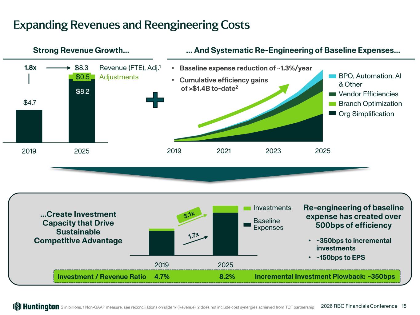 Abundant Green R: 126 G: 207 B: 28 Dark Teal R: 3 G: 79 B: 84 Pastel Teal R: 184 G: 239 B: 228 Pastel Magenta R: 248 G: 224 B: 229 White R: 255 G: 255 B: 255 Prosperous Sage R: 0 G: 45 B: 42 Primary Palette Off-White R: 245 G: 245 B: 245 Highlight Green R: 177 G: 238 B: 44 Legacy Green R: 45 G: 130 B: 42 Light Teal R: 121 G: 222 B: 226 Deep Sage R: 33 G: 72 B: 70 Highlight Teal R: 58 G: 204 B: 223 Charts/Graphs Palette Pastel Magenta R: 248 G: 224 B: 229 Dark Magenta R: 80 G: 16 B: 89 Highlight Magenta R: 193 G: 22 B: 216 Capstone Blue R: 4 G: 30 B: 66 Deep Magenta R: 144 G: 5 B: 163 Second Palette 2026 RBC Financials Conference 15$ in billions; 1 Non -GAAP measure, see reconciliations on slide 17 (Revenue); 2 does not include cost synergies achieved from TC F partnership 2019 2021 2023 2025 Expanding Revenues and Reengineering Costs Strong Revenue Growth… … And Systematic Re -Engineering of Baseline Expenses… 2019 2025 …Create Investment Capacity that Drive Sustainable Competitive Advantage Baseline Expenses Investments Re -engineering of baseline expense has created over 500bps of efficiency • ~350bps to incremental investments • ~150bps to EPS • Baseline expense reduction of ~1.3%/year • Cumulative efficiency gains of >$1.4B to- date 2 Investment / Revenue Ratio 4.7% 8.2% $4.7 $8.2 $0.5 2019 2025 1.8x $8.3 Adjustments Revenue (FTE), Adj. 1 Org Simplification Branch Optimization Vendor Efficiencies BPO, Automation, AI & Other ~350bpsIncremental Investment Plowback:
