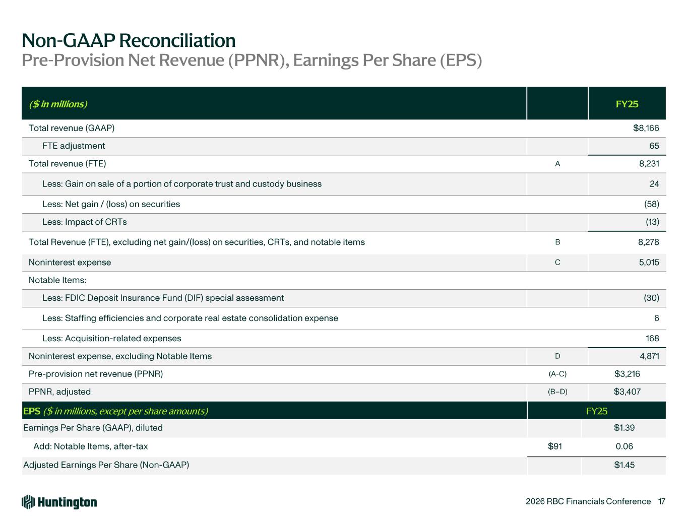 Abundant Green R: 126 G: 207 B: 28 Dark Teal R: 3 G: 79 B: 84 Pastel Teal R: 184 G: 239 B: 228 Pastel Magenta R: 248 G: 224 B: 229 White R: 255 G: 255 B: 255 Prosperous Sage R: 0 G: 45 B: 42 Primary Palette Off-White R: 245 G: 245 B: 245 Highlight Green R: 177 G: 238 B: 44 Legacy Green R: 45 G: 130 B: 42 Light Teal R: 121 G: 222 B: 226 Deep Sage R: 33 G: 72 B: 70 Highlight Teal R: 58 G: 204 B: 223 Charts/Graphs Palette Pastel Magenta R: 248 G: 224 B: 229 Dark Magenta R: 80 G: 16 B: 89 Highlight Magenta R: 193 G: 22 B: 216 Capstone Blue R: 4 G: 30 B: 66 Deep Magenta R: 144 G: 5 B: 163 Second Palette 2026 RBC Financials Conference 17 Non-GAAP Reconciliation Pre-Provision Net Revenue (PPNR), Earnings Per Share (EPS) ($ in millions) FY25 Total revenue (GAAP) $8,166 FTE adjustment 65 Total revenue (FTE) A 8,231 Less: Gain on sale of a portion of corporate trust and custody business 24 Less: Net gain / (loss) on securities (58) Less: Impact of CRTs (13) Total Revenue (FTE), excluding net gain/(loss) on securities, CRTs, and notable items B 8,278 Noninterest expense C 5,015 Notable Items: Less: FDIC Deposit Insurance Fund (DIF) special assessment (30) Less: Staffing efficiencies and corporate real estate consolidation expense 6 Less: Acquisition -related expenses 168 Noninterest expense, excluding Notable Items D 4,871 Pre -provision net revenue (PPNR) (A-C) $3,216 PPNR, adjusted (B–D) $3,407 EPS ($ in millions, except per share amounts) FY25 Earnings Per Share (GAAP), diluted $1.39 Add: Notable Items, after -tax $91 0.06 Adjusted Earnings Per Share (Non -GAAP) $1.45
